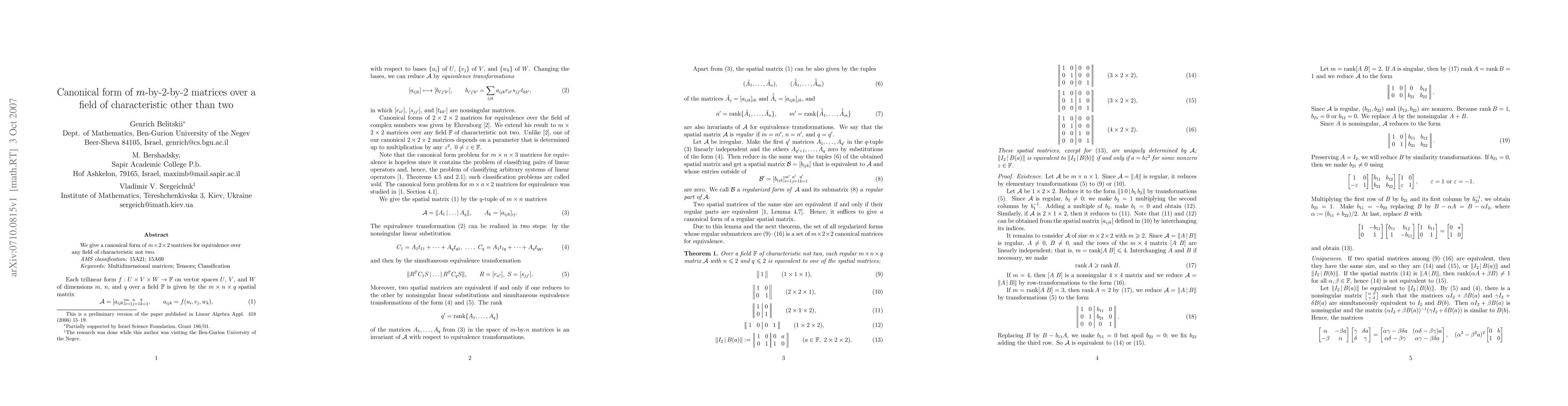We give a canonical form of m-by-2-by-2 matrices for equivalence over any field of characteristic not two.