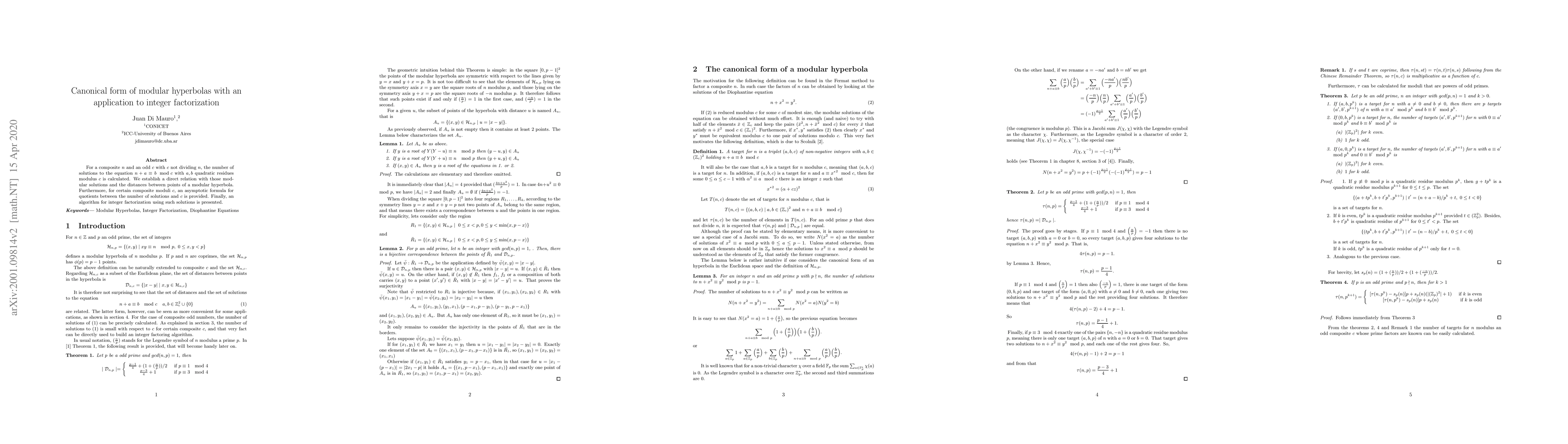 For a composite $n$ and an odd $c$ with $c$ not dividing $n$, the number of solutions to the equation $n+a\equiv b\mod c$ with $a,b$ quadratic residues modulus $c$ is calculated. We establish a direct relation with those modular solutions and the distances between points of a modular hyperbola. Furthermore, for certain composite moduli $c$, an asymptotic formula for quotients between the number of solutions and $c$ is provided. Finally, an algorithm for integer factorization using such solutions is presented.