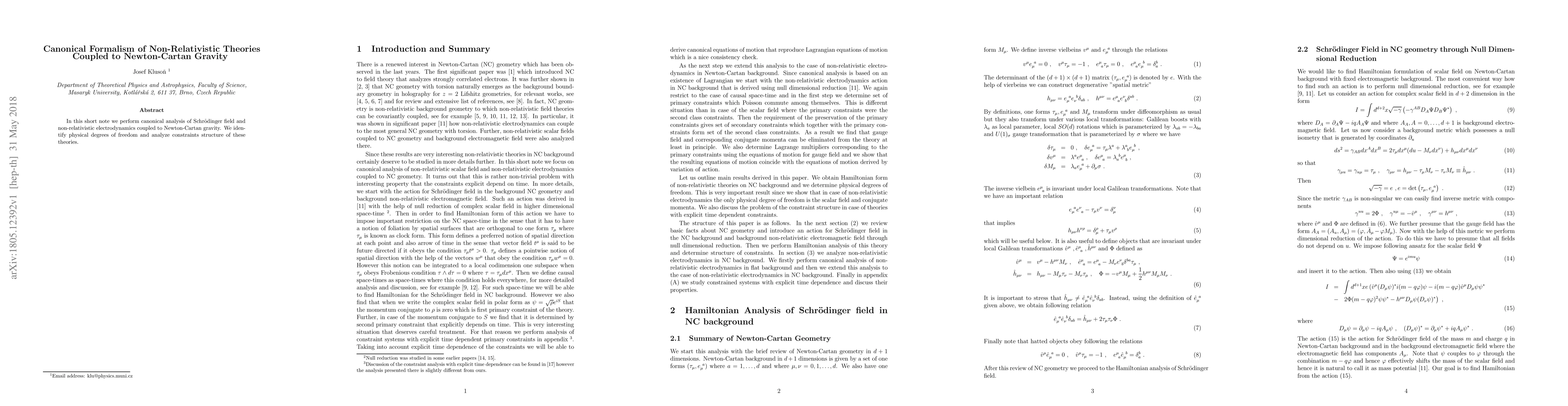 This paper conducts a canonical analysis of non-relativistic theories, specifically Schrödinger fields and non-relativistic electrodynamics, when coupled to Newton-Cartan gravity, identifying physical degrees of freedom and examining the constraints structure of these systems.