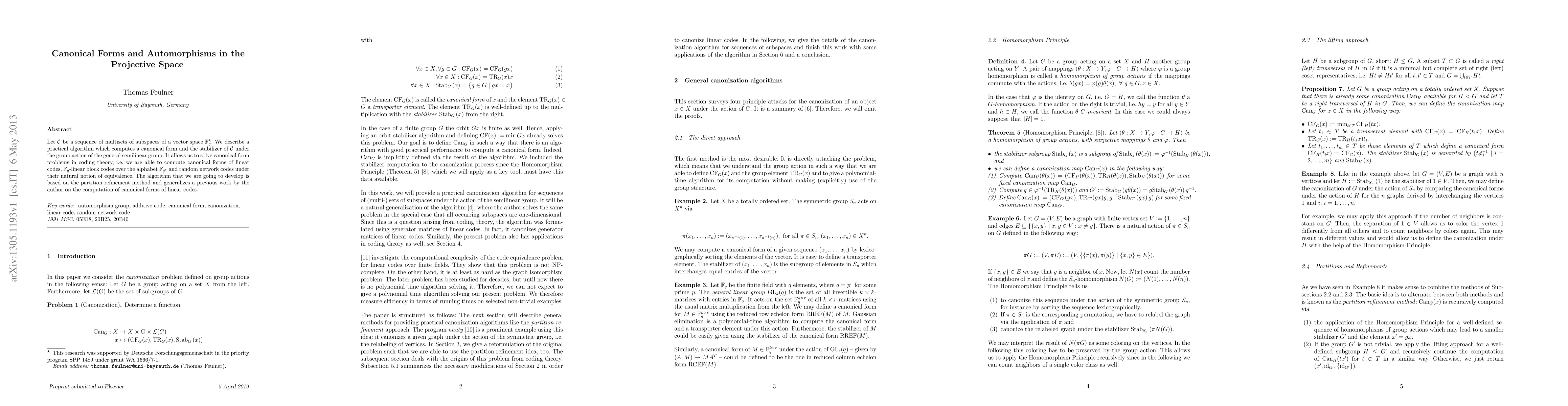 Let $\C$ be a sequence of multisets of subspaces of a vector space $\F_q^k$. We describe a practical algorithm which computes a canonical form and the stabilizer of $\C$ under the group action of the general semilinear group. It allows us to solve canonical form problems in coding theory, i.e. we are able to compute canonical forms of linear codes, $\F_{q}$-linear block codes over the alphabet $\F_{q^s}$ and random network codes under their natural notion of equivalence. The algorithm that we are going to develop is based on the partition refinement method and generalizes a previous work by the author on the computation of canonical forms of linear codes.