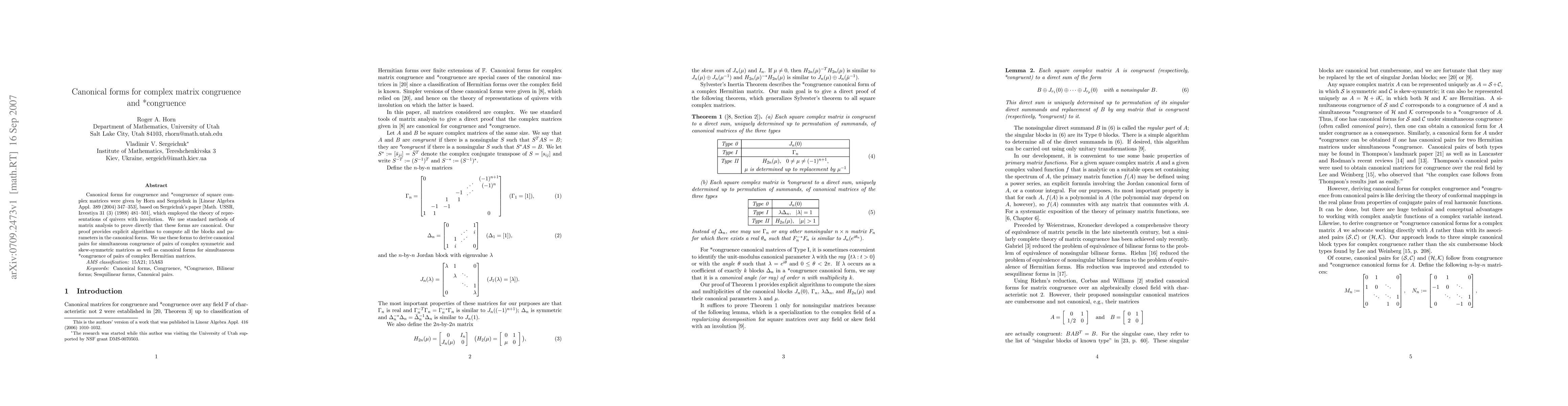 This paper presents canonical forms for complex matrix congruence and *congruence, proving their uniqueness directly using matrix analysis and providing explicit algorithms for computation. It also derives canonical pairs for simultaneous congruence of complex symmetric and skew-symmetric matrices and canonical forms for simultaneous *congruence of complex Hermitian matrices.
