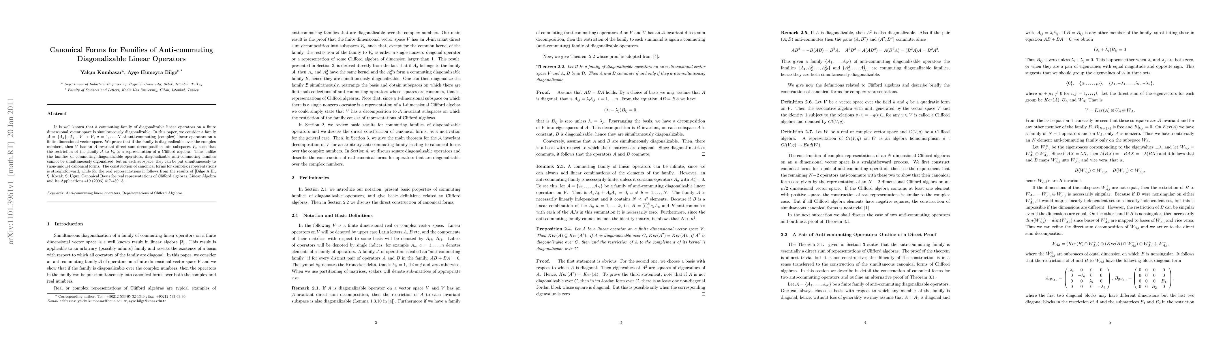 This paper explores canonical forms for families of anti-commuting diagonalizable linear operators on finite-dimensional vector spaces. It proves that such families can be decomposed into subspaces where each subspace's operator representation aligns with a Clifford algebra, allowing for non-simultaneous but canonical diagonalization on each subspace.
