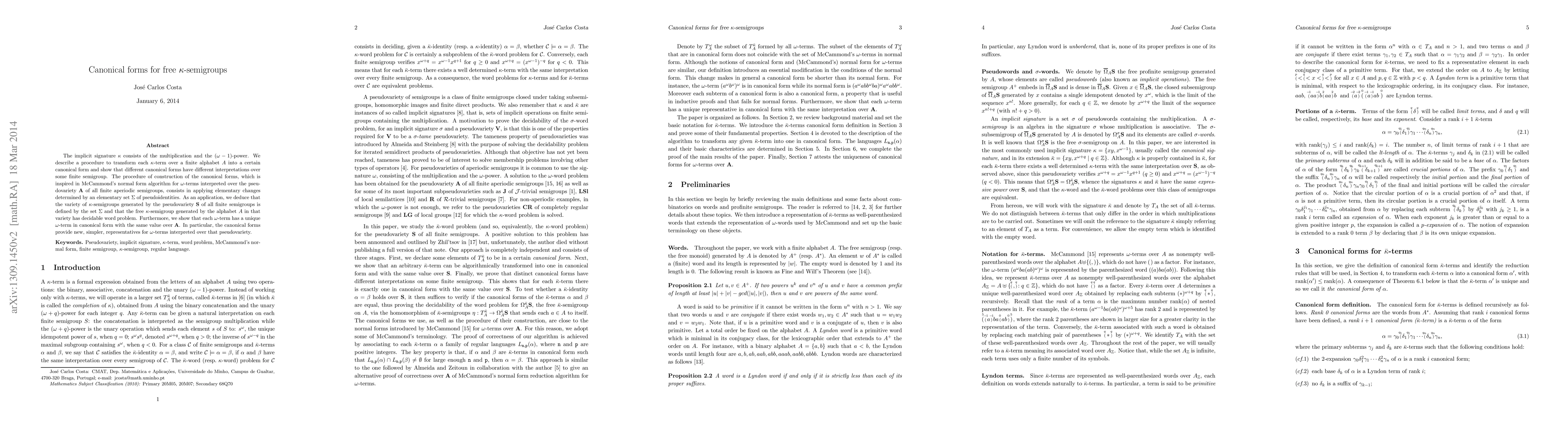 The paper describes a procedure to transform κ-terms into canonical forms using a set of pseudoidentities, inspired by McCammond's normal form algorithm. It shows that these canonical forms allow for decidable word problems in the variety of κ-semigroups and provide simpler representatives for ω-terms interpreted over a pseudovariety.