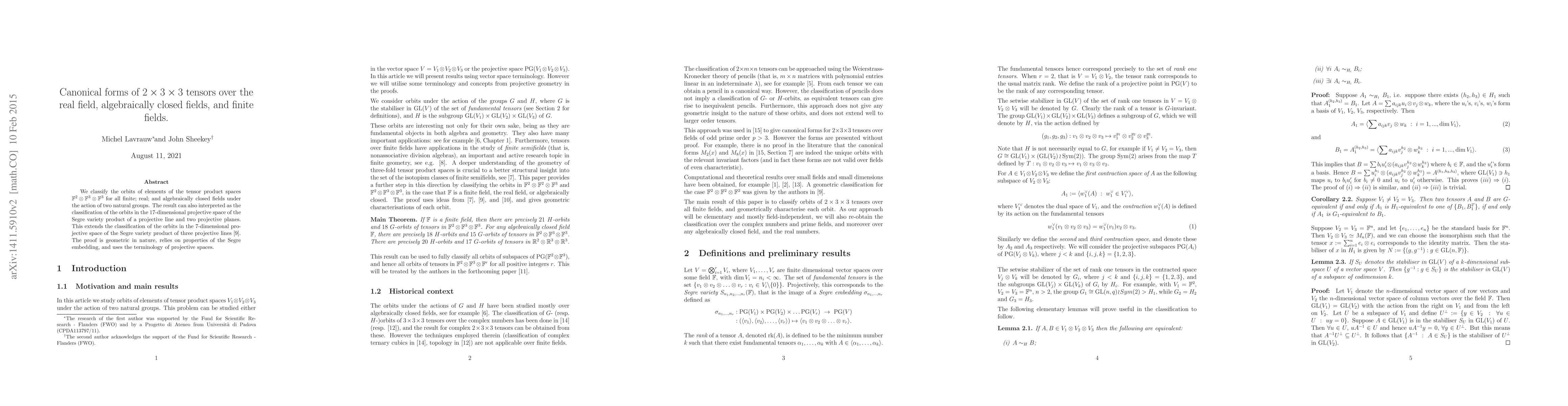 We classify the orbits of elements of the tensor product spaces ${\mathbb{F}}^2\otimes {\mathbb{F}}^3 \otimes {\mathbb{F}}^3$ for all finite; real; and algebraically closed fields under the action of two natural groups. The result can also be interpreted as the classification of the orbits in the $17$-dimensional projective space of the Segre variety product of a projective line and two projective planes. This extends the classification of the orbits in the $7$-dimensional projective space of the Segre variety product of three projective lines [M. Lavrauw and J. Sheekey: Orbits of the stabiliser group of the Segre variety product of three projective lines, Finite Fields Appl. (2014)]. The proof is geometric in nature, relies on properties of the Segre embedding, and uses the terminology of projective spaces.
