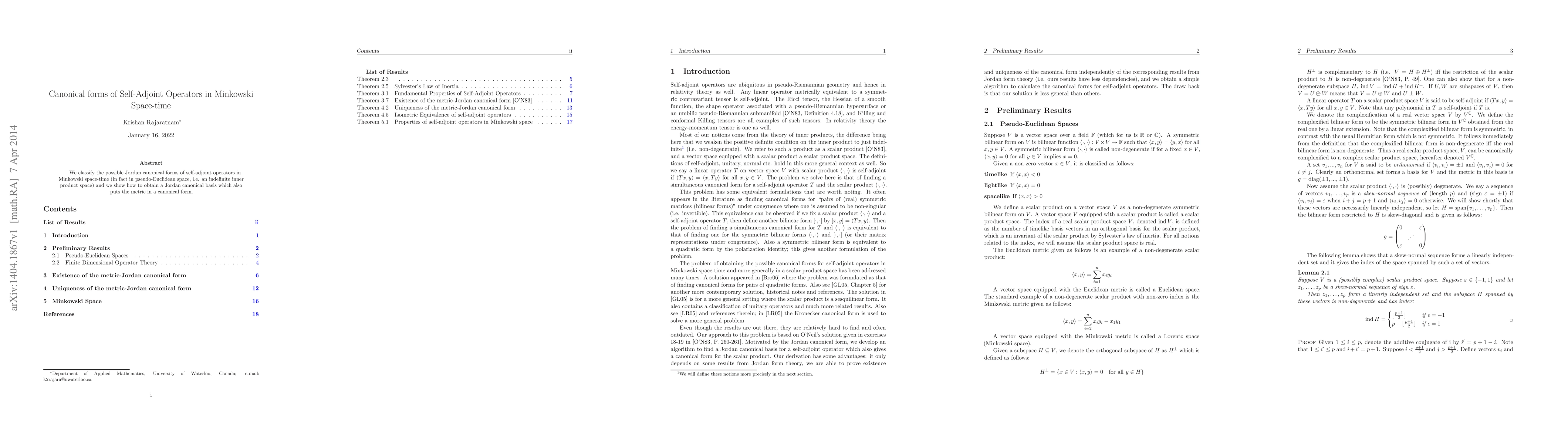 This paper classifies the Jordan canonical forms of self-adjoint operators in pseudo-Euclidean space, demonstrating a method to achieve a canonical basis that simultaneously normalizes the metric. The focus is on Minkowski space-time, an indefinite inner product space.