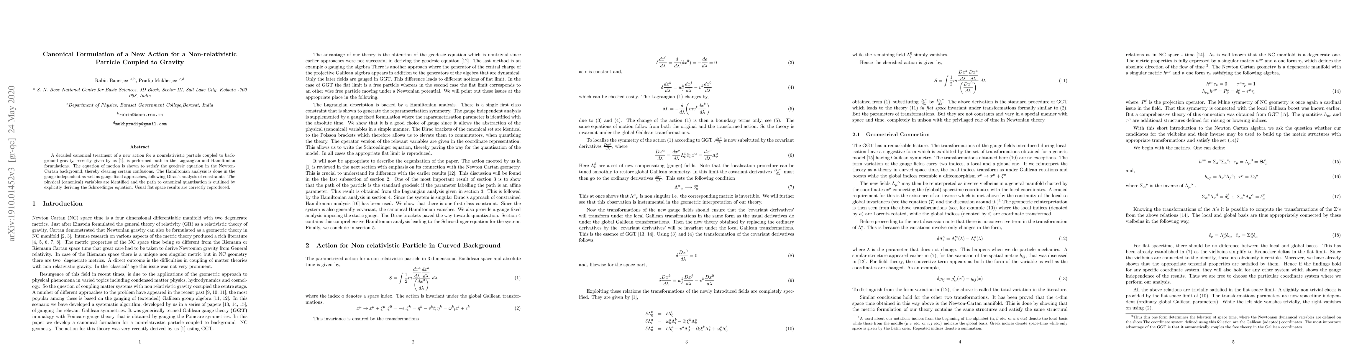 This paper provides a canonical analysis of a new action for a non-relativistic particle coupled to gravity, demonstrating that the derived equations of motion satisfy the geodesic equation in a Newton-Cartan framework. The study includes both Lagrangian and Hamiltonian formulations, identifying physical variables and outlining the path to canonical quantization.