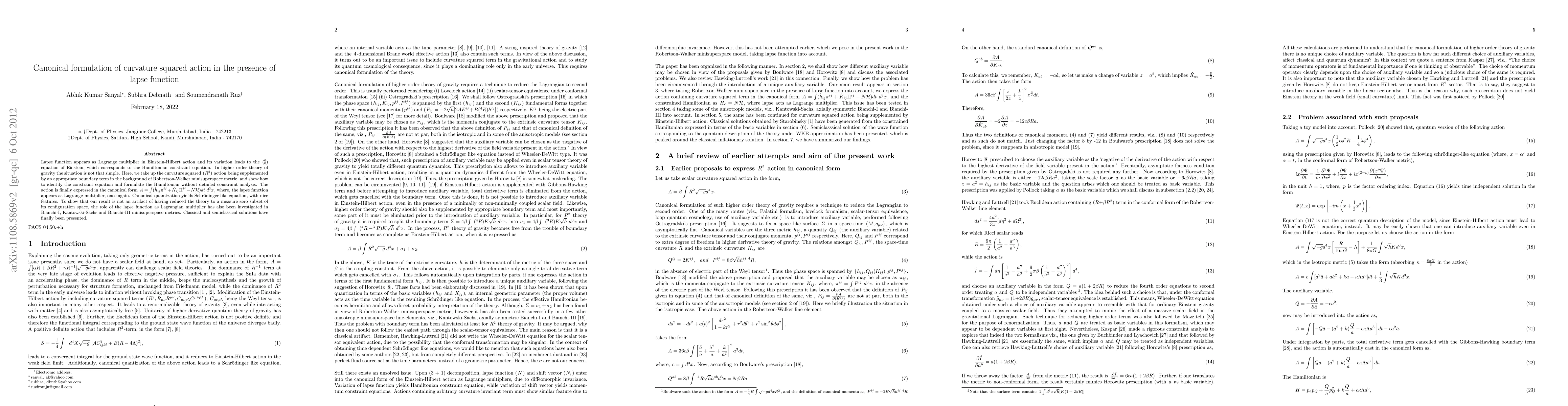 Lapse function appears as Lagrange multiplier in Einstein-Hilbert action and its variation leads to the (0 0) equation of Einstein, which corresponds to the Hamiltonian constraint equation. In higher order theory of gravity the situation is not that simple. Here, we take up the curvature squared (R^2) action being supplemented by an appropriate boundary term in the background of Robertson-Walker minisuperspace metric, and show how to identify the constraint equation and formulate the Hamiltonian without detailed constraint analysis. The action is finally expressed in the canonical form $A = \int(\dot h_{ij} \pi^{ij} + \dot K_{ij}\Pi^{ij} - N{\mathcal H})dt \sim d^3 x$, where, the lapse function appears as Lagrange multiplier, once again. Canonical quantization yields Schr\"odinger like equation, with nice features. To show that our result is not an artifact of having reduced the theory to a measure zero subset of its configuration space, the role of the lapse function as Lagrangian multiplier has also been investigated in Bianchi-I, Kantowski-Sachs and Bianchi-III minisuperspace metrics. Classical and semiclassical solutions have finally been presented.
