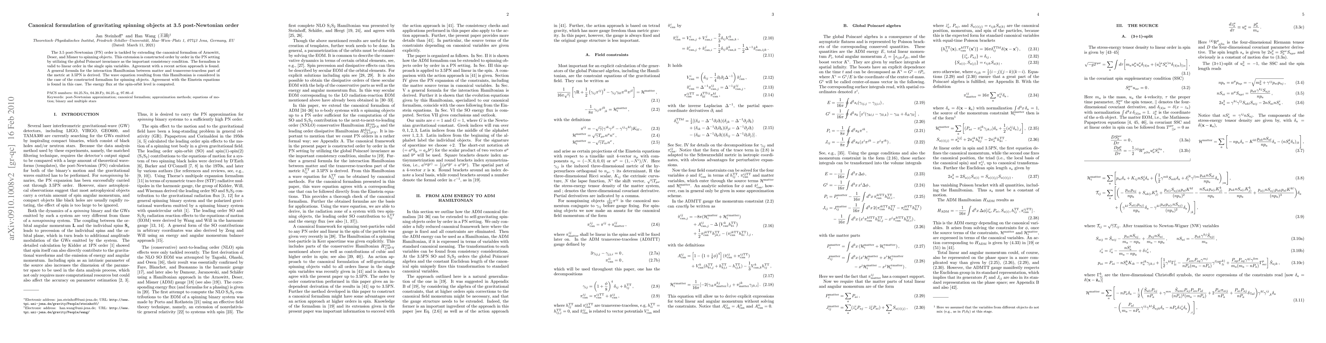 The 3.5 post-Newtonian (PN) order is tackled by extending the canonical formalism of Arnowitt, Deser, and Misner to spinning objects. This extension is constructed order by order in the PN setting by utilizing the global Poincare invariance as the important consistency condition. The formalism is valid to linear order in the single spin variables. Agreement with a recent action approach is found. A general formula for the interaction Hamiltonian between matter and transverse-traceless part of the metric at 3.5PN is derived. The wave equation resulting from this Hamiltonian is considered in the case of the constructed formalism for spinning objects. Agreement with the Einstein equations is found in this case. The energy flux at the spin-orbit level is computed.