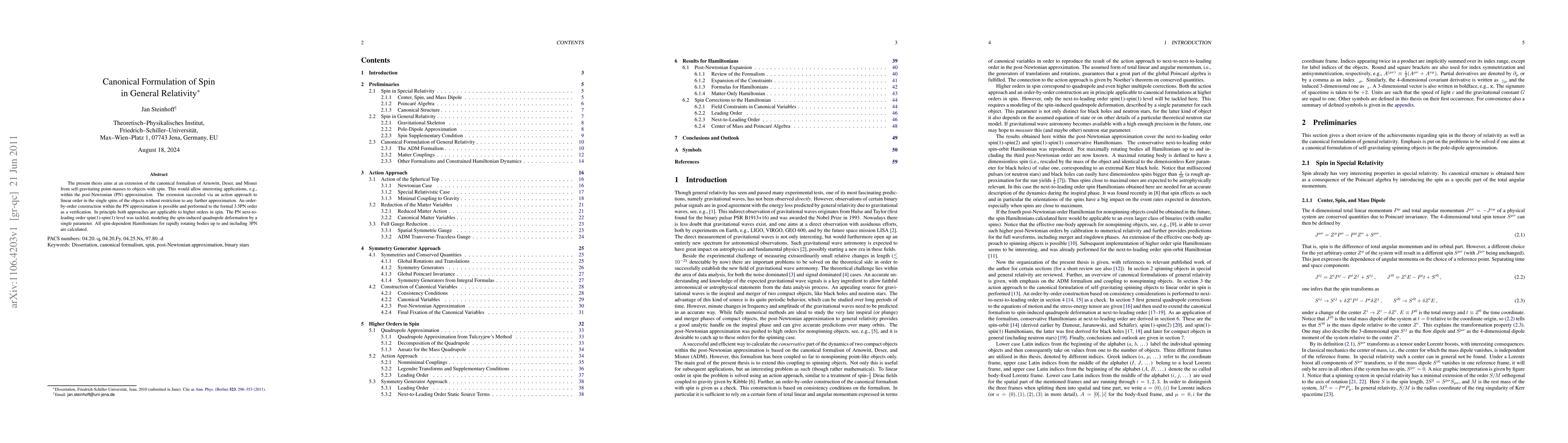 The present thesis aims at an extension of the canonical formalism of Arnowitt, Deser, and Misner from self-gravitating point-masses to objects with spin. This would allow interesting applications, e.g., within the post-Newtonian (PN) approximation. The extension succeeded via an action approach to linear order in the single spins of the objects without restriction to any further approximation. An order-by-order construction within the PN approximation is possible and performed to the formal 3.5PN order as a verification. In principle both approaches are applicable to higher orders in spin. The PN next-to-leading order spin(1)-spin(1) level was tackled, modeling the spin-induced quadrupole deformation by a single parameter. All spin-dependent Hamiltonians for rapidly rotating bodies up to and including 3PN are calculated.