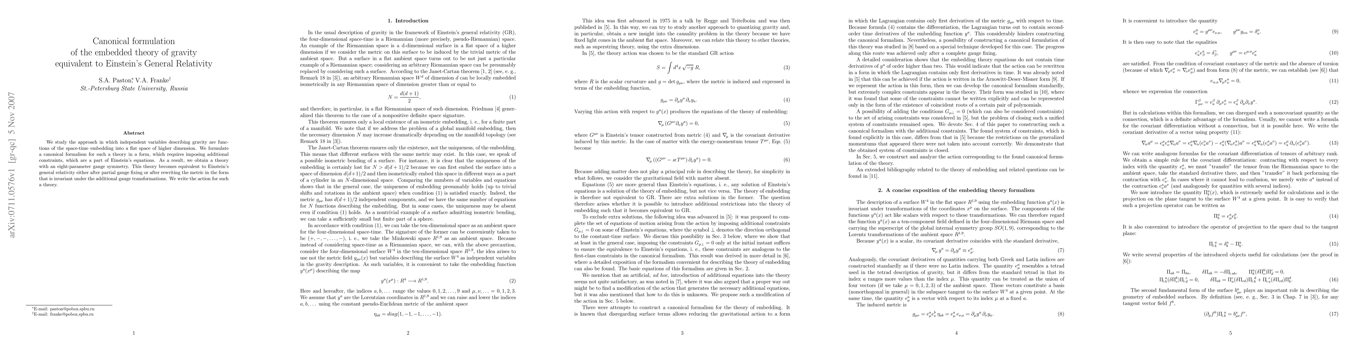 This paper develops a canonical formulation of an embedded theory of gravity that is equivalent to Einstein's General Relativity through additional constraints and gauge symmetries, ultimately showing equivalence via partial gauge fixing or invariant metric rewriting. The theory features an eight-parameter gauge symmetry.