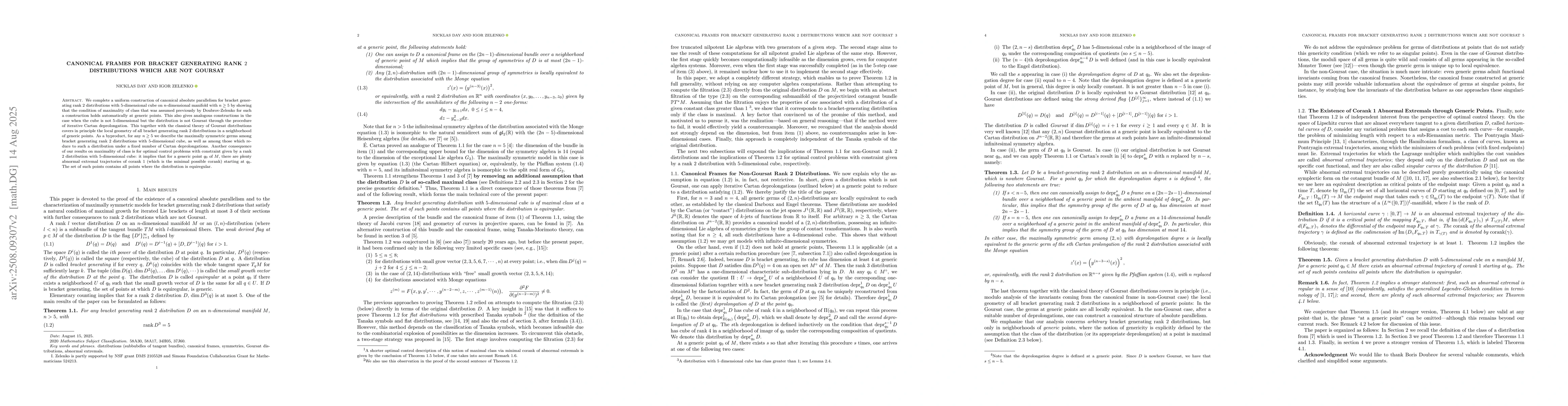 We complete a uniform construction of canonical absolute parallelism for bracket generating rank $2$ distributions with $5$-dimensional cube on $n$-dimensional manifold with $n\geq 5$ by showing that the condition of maximality of class that was assumed previously by Doubrov-Zelenko for such a construction holds automatically at generic points. This also gives analogous constructions in the case when the cube is not $5$-dimensional but the distribution is not Goursat through the procedure of iterative Cartan deprolongation. This together with the classical theory of Goursat distributions covers in principle the local geometry of all bracket generating rank 2 distributions in a neighborhood of generic points. As a byproduct, for any $n\geq 5$ we describe the maximally symmetric germs among bracket generating rank $2$ distributions with $5$-dimensional cube, as well as among those which reduce to such a distribution under a fixed number of Cartan deprolongations. Another consequence of our results on maximality of class is for optimal control problems with constraint given by a rank $2$ distribution with $5$-dimensional cube: it implies that for a generic point $q_0$ of $M$, there are plenty abnormal extremal trajectories of corank $1$ (which is the minimal possible corank) starting at $q_0$. The set of such points contains all points where the distribution is equiregular.