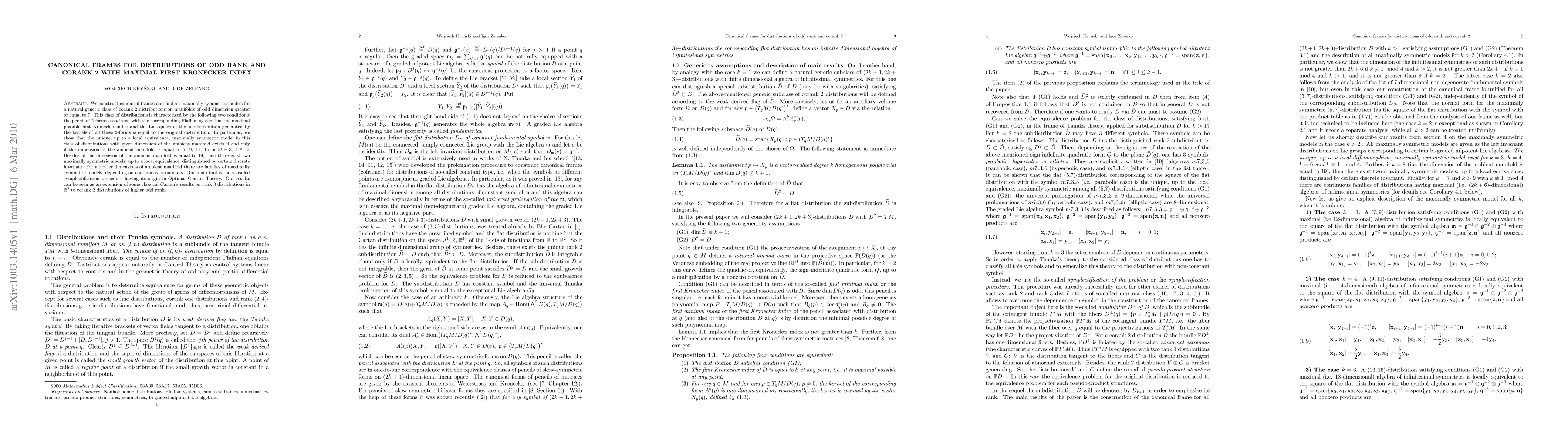 This paper constructs canonical frames and identifies maximally symmetric models for a specific class of corank 2 distributions on odd-dimensional manifolds, showing unique existence for certain dimensions and families of models for others. The study employs a symplectification procedure rooted in Optimal Control Theory to extend classical Cartan's results.