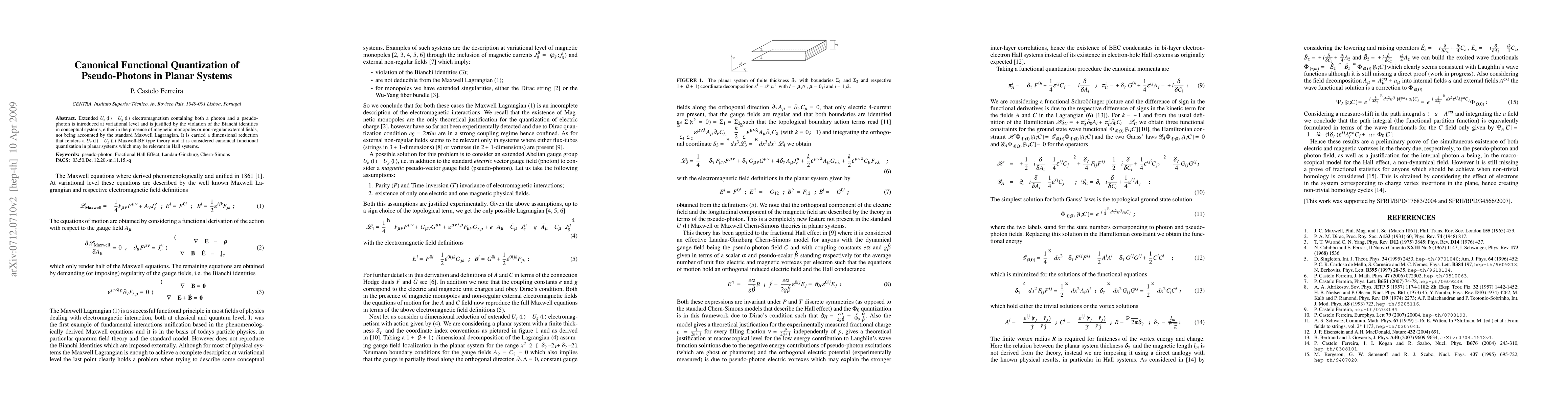 The research introduces an extended $U_e(1) imes U_g(1)$ electromagnetism containing both a photon and a pseudo-photon, validated by violations of Bianchi identities in conceptual systems involving magnetic monopoles or non-regular external fields. It then performs a dimensional reduction to obtain a $U_e(1) imes U_g(1)$ Maxwell-BF type theory, applying canonical functional quantization in planar systems relevant to Hall systems.