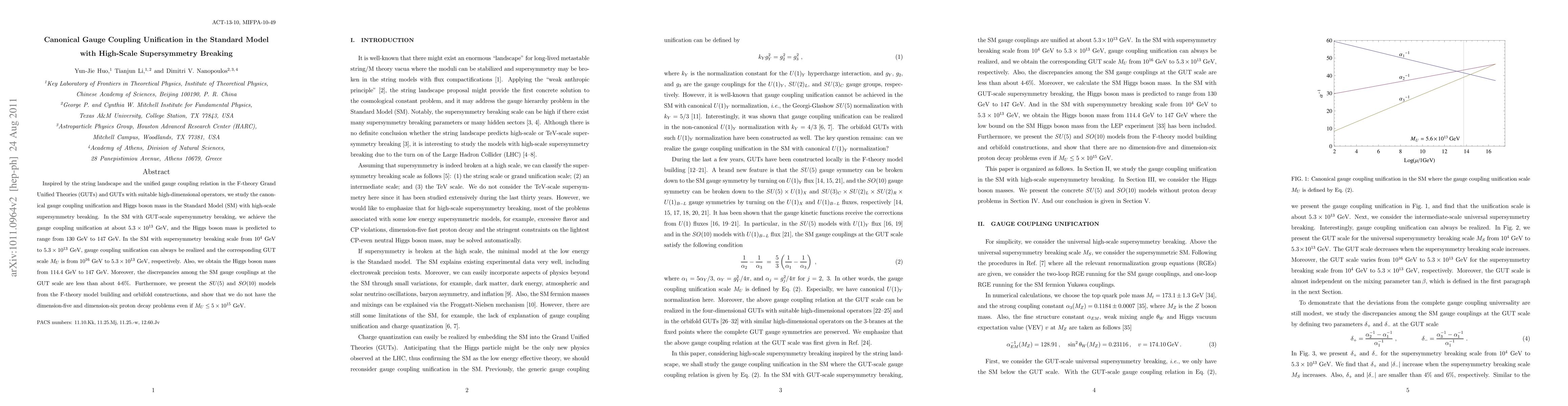 Inspired by the string landscape and the unified gauge coupling relation in the F-theory Grand Unified Theories (GUTs) and GUTs with suitable high-dimensional operators, we study the canonical gauge coupling unification and Higgs boson mass in the Standard Model (SM) with high-scale supersymmetry breaking. In the SM with GUT-scale supersymmetry breaking, we achieve the gauge coupling unification at about 5.3 x 10^{13} GeV, and the Higgs boson mass is predicted to range from 130 GeV to 147 GeV. In the SM with supersymmetry breaking scale from 10^4 GeV to 5.3 x 10^{13} GeV, gauge coupling unification can always be realized and the corresponding GUT scale M_U is from 10^{16} GeV to 5.3 x 10^{13} GeV, respectively. Also, we obtain the Higgs boson mass from 114.4 GeV to 147 GeV. Moreover, the discrepancies among the SM gauge couplings at the GUT scale are less than about 4-6%. Furthermore, we present the SU(5) and SO(10) models from the F-theory model building and orbifold constructions, and show that we do not have the dimension-five and dimension-six proton decay problems even if M_U \le 5 x 10^{15} GeV.