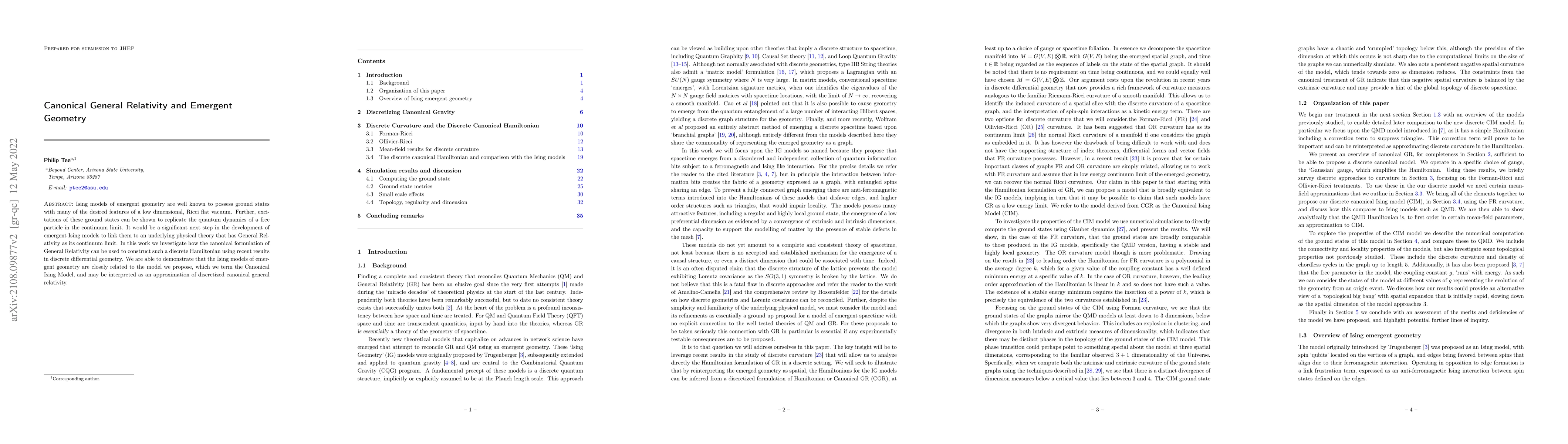 This paper explores the relationship between Ising models of emergent geometry and canonical General Relativity, proposing a new discrete Hamiltonian based on canonical formulations and discrete differential geometry. The authors demonstrate that these Ising models can approximate discretized canonical general relativity.
