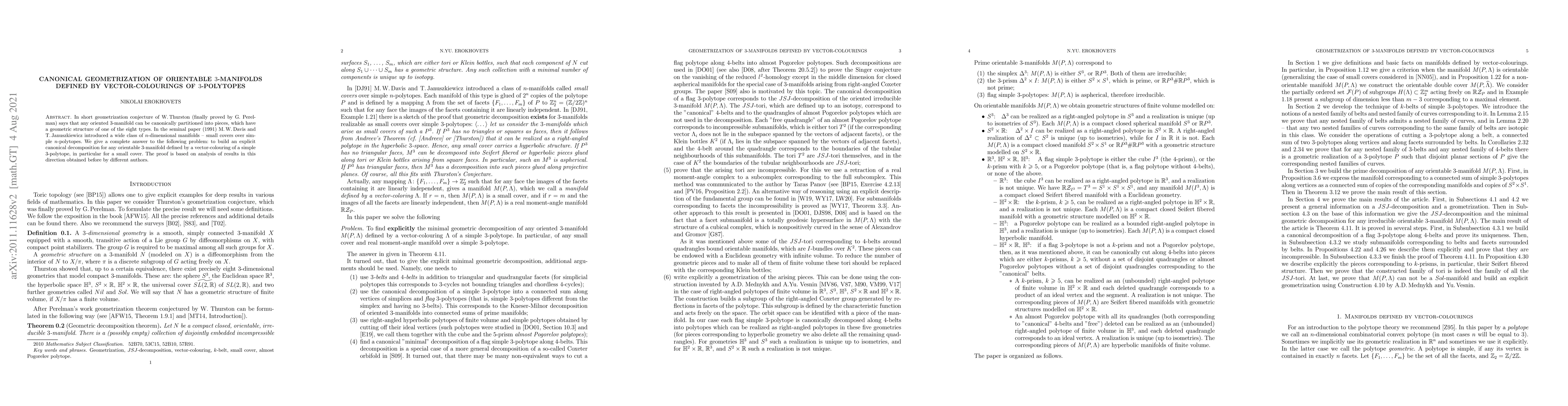 This paper presents a method to explicitly decompose any orientable 3-manifold defined by vector-colourings of 3-polytopes into canonical pieces, following the geometrization conjecture by Thurston and Perelman. The approach synthesizes previous results to achieve this canonical decomposition.