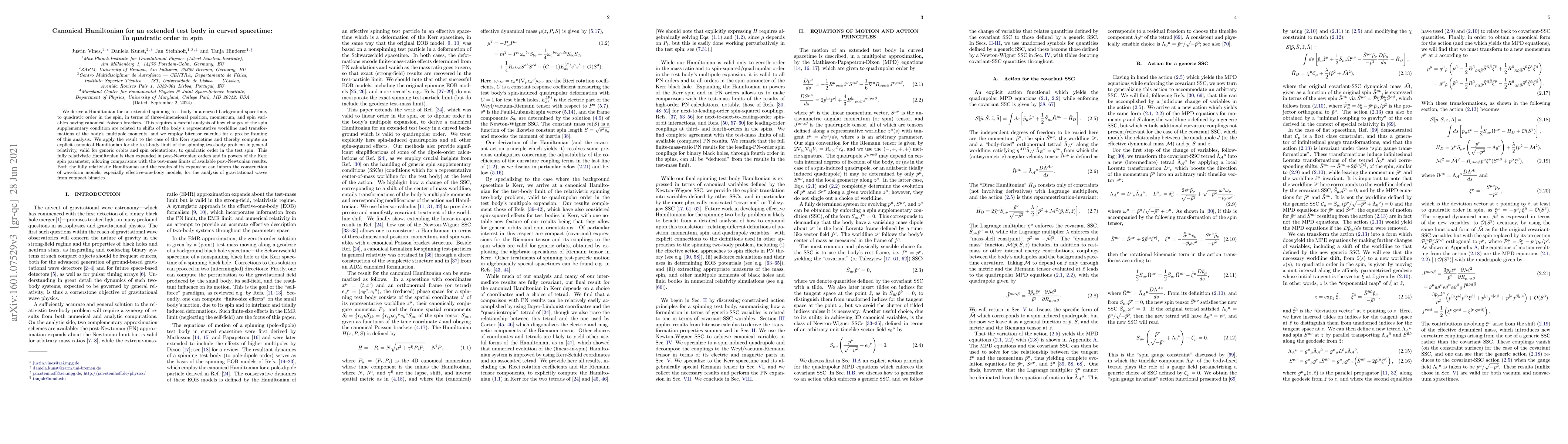 This paper derives a Hamiltonian for an extended spinning test body in curved spacetime to quadratic order in spin, employing bitensor calculus and canonical Poisson brackets. It applies the result to Kerr spacetime to compute a canonical Hamiltonian for the spinning two-body problem in general relativity, which is then expanded for comparison with post-Newtonian results and to inform gravitational wave models.