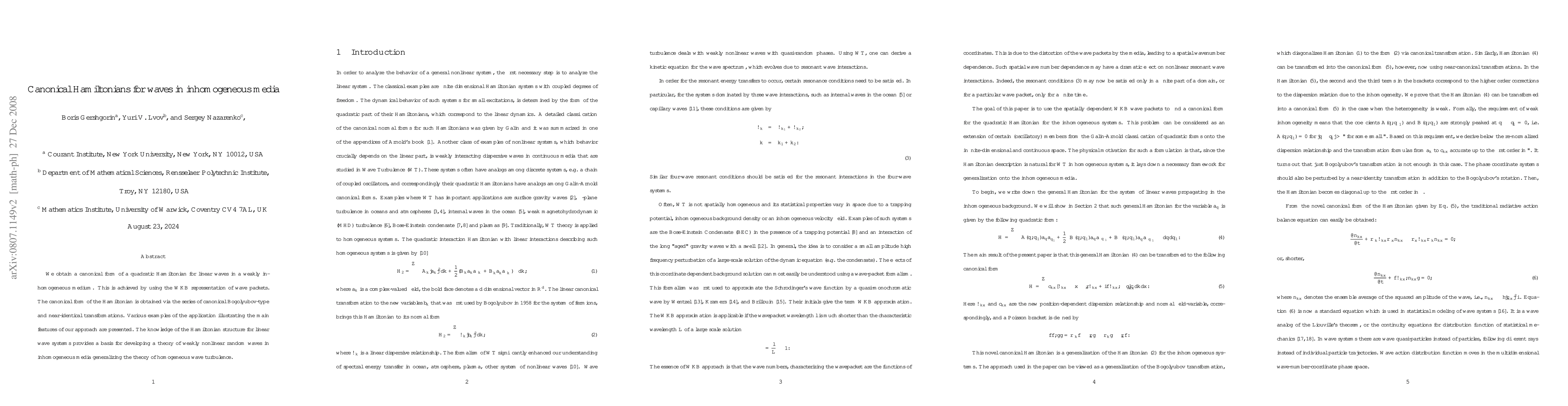 This paper derives a canonical quadratic Hamiltonian for linear waves in weakly inhomogeneous media using WKB wave packet representation and Bogolyubov-type transformations. The approach provides a foundation for extending theories of wave turbulence to nonlinear random waves in inhomogeneous environments.
