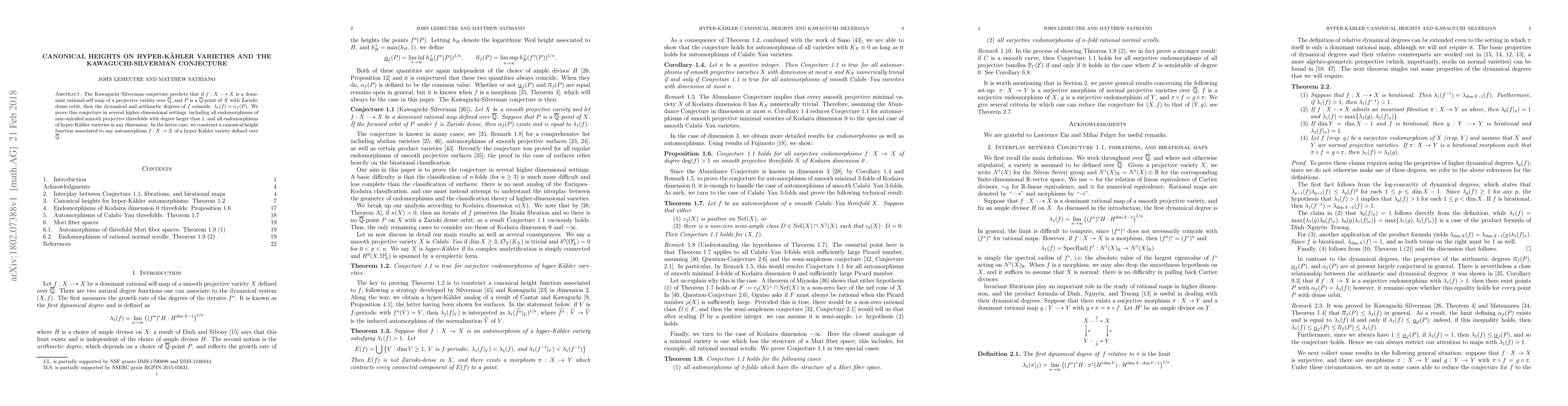 The introduction of a canonical height function for automorphisms of hyper-Kähler varieties and the proof of the Kawaguchi-Silverman conjecture in specific higher-dimensional settings.