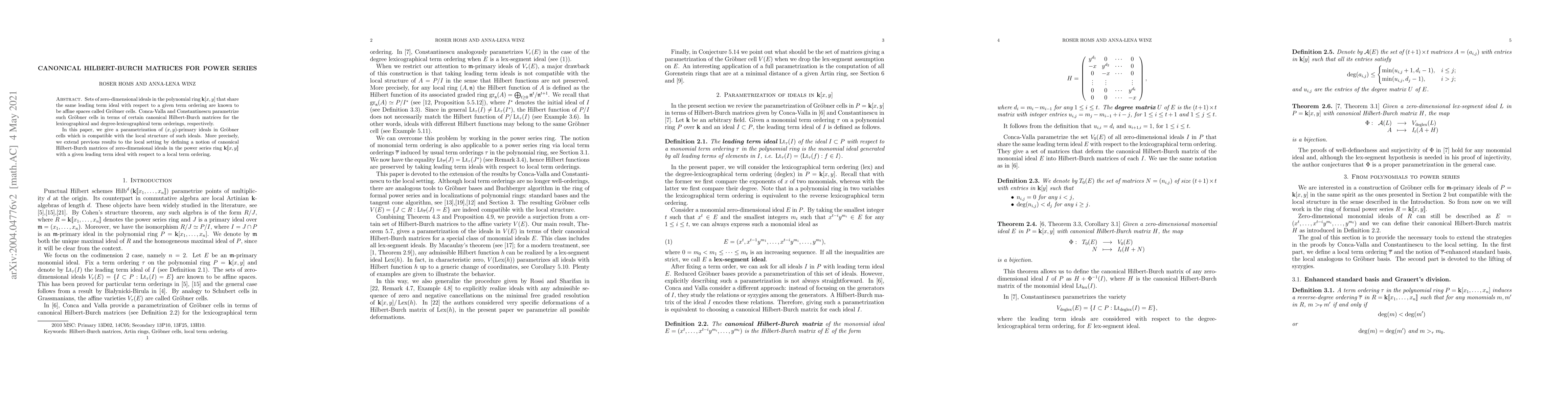 This paper extends the parametrization of Gr\"obner cells in polynomial rings to the local setting, defining canonical Hilbert-Burch matrices for $(x,y)$-primary ideals in the power series ring $k[[x,y]]$ with respect to a local term ordering. This provides a compatible framework for understanding the local structure of such ideals.