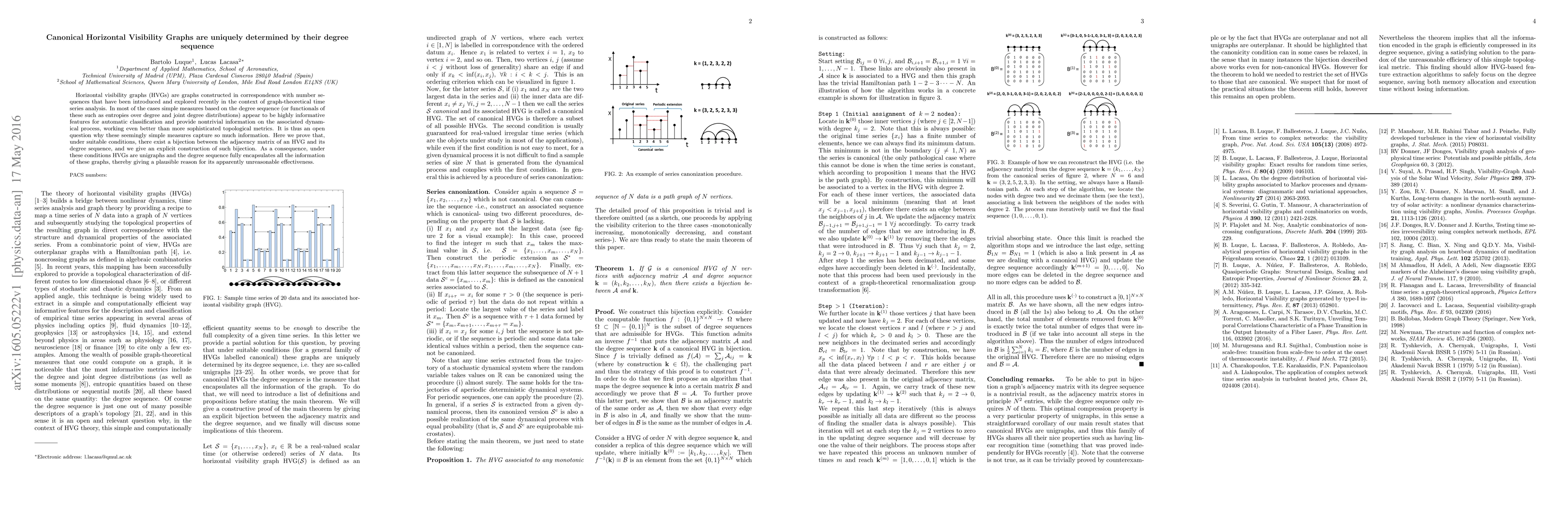 This paper proves that canonical horizontal visibility graphs (HVGs) are uniquely determined by their degree sequence, establishing a bijection between the HVG's adjacency matrix and its degree sequence. This finding explains why simple degree-based measures are highly effective in classifying HVGs and capturing information about the underlying dynamical process.
