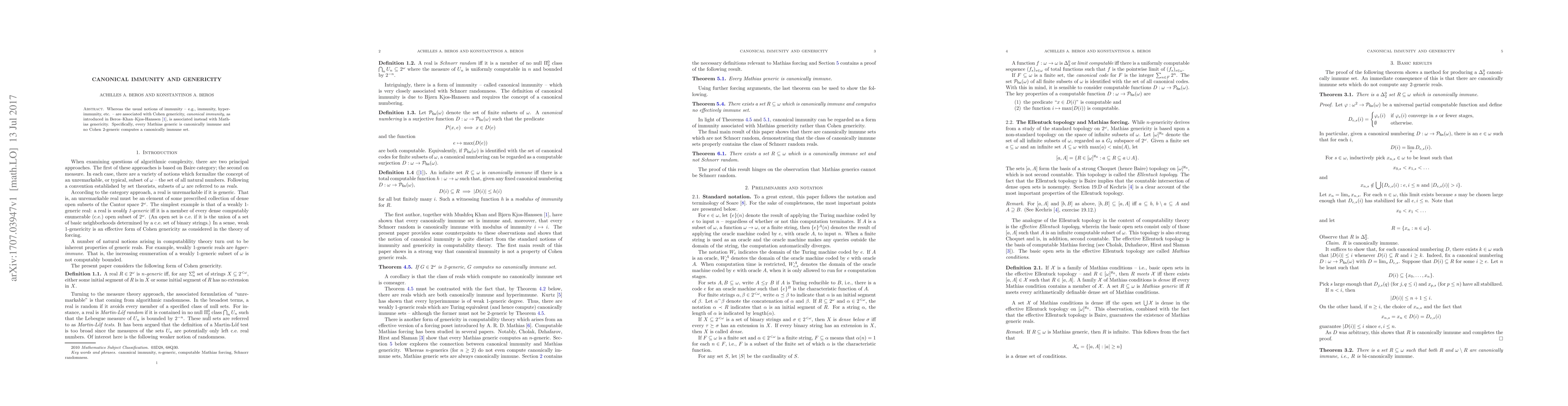 Summary: Canonical immunity, introduced by Beros, Khan, and Kjos-Hanssen, differs from traditional immunity notions by linking to Mathias genericity rather than Cohen genericity. Every Mathias generic set is canonically immune, while no Cohen 2-generic set computes a canonically immune set.