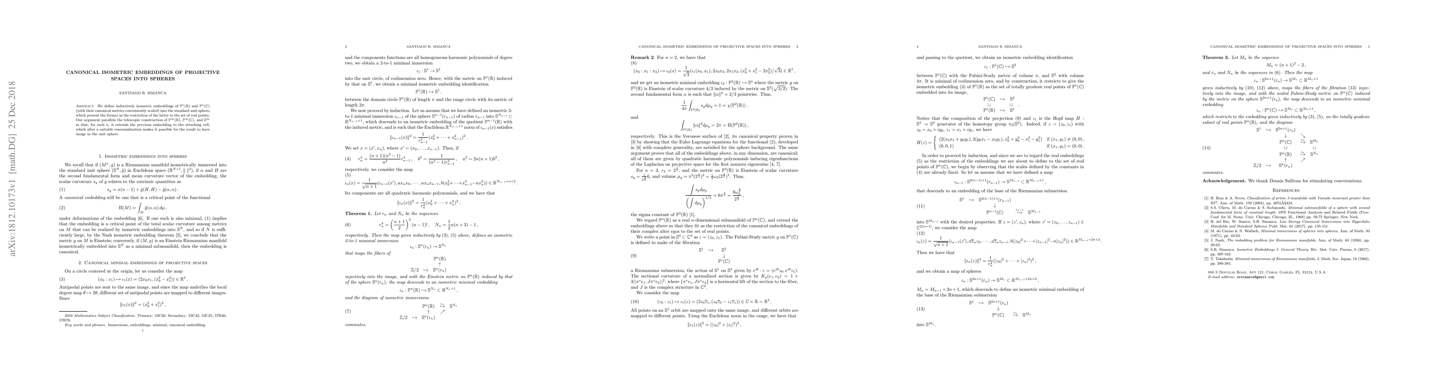 We define inductively isometric embeddings of $\mb{P}^n(\mb{R})$ and $\mb{P}^n(\mb{C})$ (with their canonical metrics conveniently scaled) into the standard unit sphere, which present the former as the restriction of the latter to the set of real points. Our argument parallels the telescopic construction of $\mb{P}^\infty(\mb{R})$, $\mb{P}^\infty(\mb{C})$, and $\mb{S}^\infty$ in that, for each $n$, it extends the previous embedding to the attaching cell, which after a suitable renormalization makes it possible for the result to have image in the unit sphere.