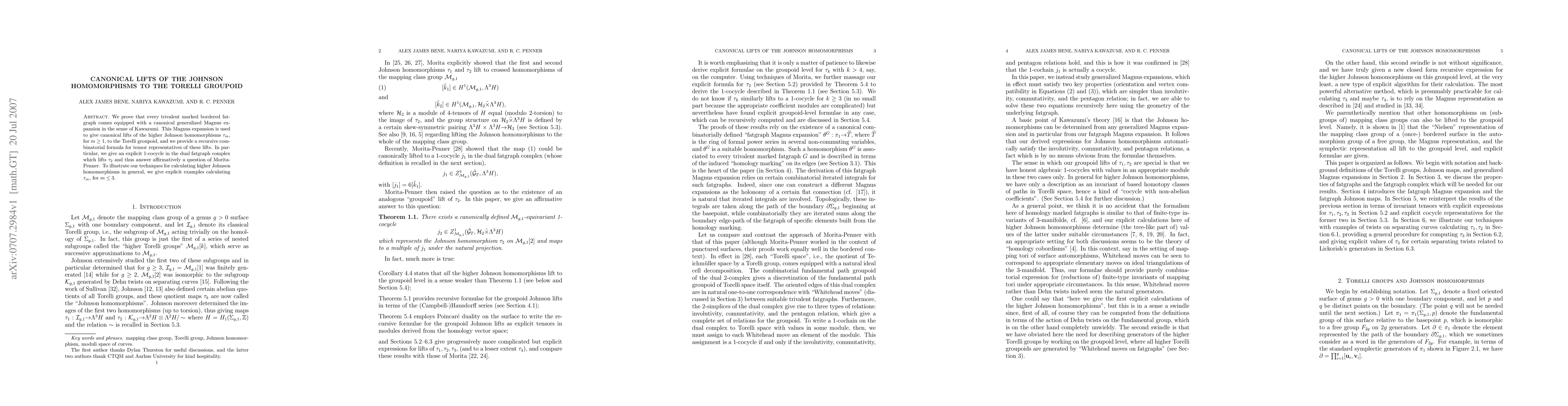 The paper establishes canonical lifts of the higher Johnson homomorphisms to the Torelli groupoid using a generalized Magnus expansion derived from trivalent marked bordered fatgraphs. It provides a recursive combinatorial formula for these lifts and explicitly calculates $\tau_m$ for $m\leq 3$.