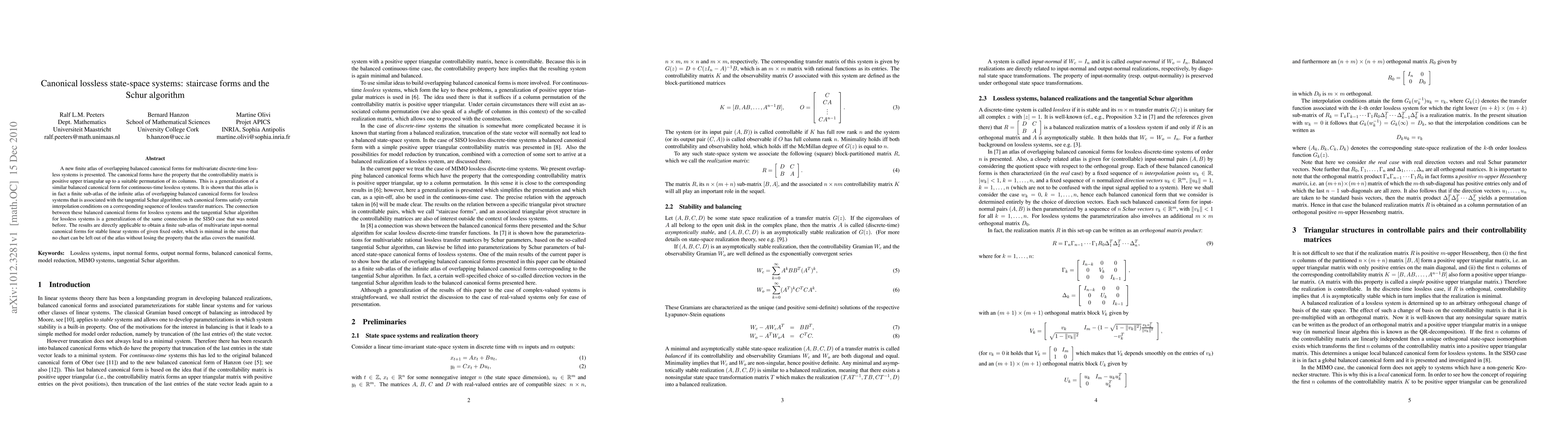 A new finite atlas of overlapping balanced canonical forms for multivariate discrete-time lossless systems is presented. The canonical forms have the property that the controllability matrix is positive upper triangular up to a suitable permutation of its columns. This is a generalization of a similar balanced canonical form for continuous-time lossless systems. It is shown that this atlas is in fact a finite sub-atlas of the infinite atlas of overlapping balanced canonical forms for lossless systems that is associated with the tangential Schur algorithm; such canonical forms satisfy certain interpolation conditions on a corresponding sequence of lossless transfer matrices. The connection between these balanced canonical forms for lossless systems and the tangential Schur algorithm for lossless systems is a generalization of the same connection in the SISO case that was noted before. The results are directly applicable to obtain a finite sub-atlas of multivariate input-normal canonical forms for stable linear systems of given fixed order, which is minimal in the sense that no chart can be left out of the atlas without losing the property that the atlas covers the manifold.