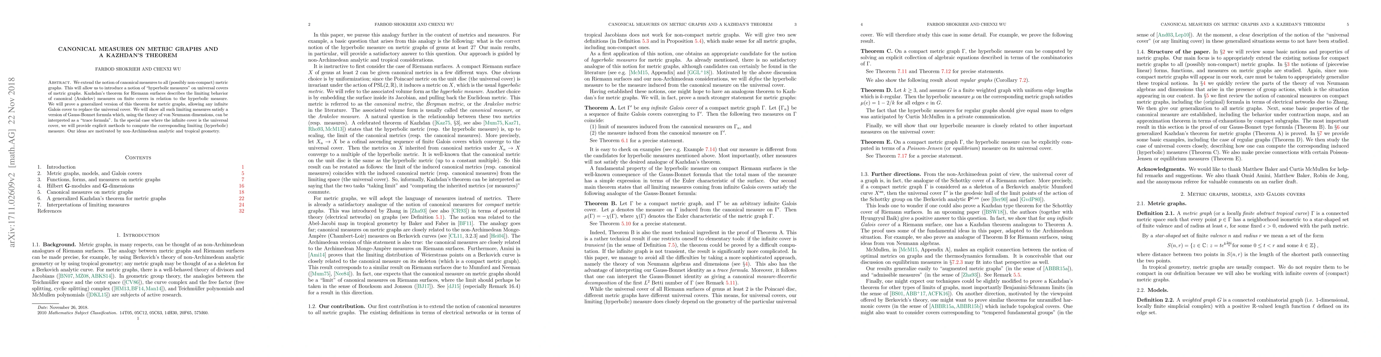 This paper extends canonical measures to metric graphs, proving a generalized version of Kazhdan's theorem for infinite Galois covers, and introducing a 'trace formula' using von Neumann dimensions.