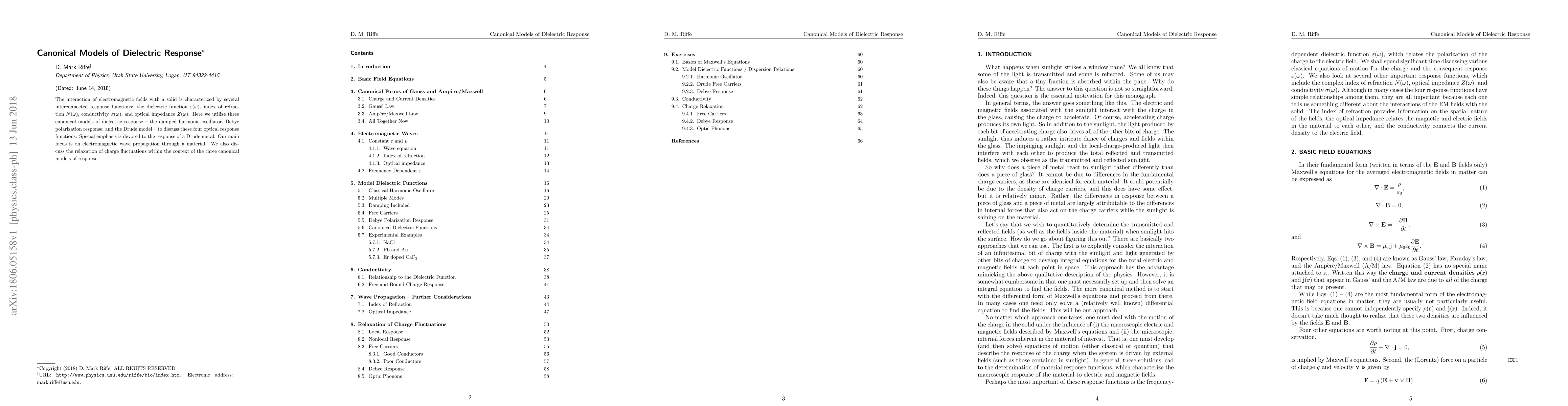 The interaction of electromagnetic fields with a solid is characterized by several interconnected response functions: the dielectric function $\varepsilon(\omega)$, index of refraction $N(\omega)$, conductivity $\sigma(\omega)$, and optical impedance $Z(\omega)$. Here we utilize three canonical models of dielectric response -- the damped harmonic oscillator, Debye polarization response, and the Drude model -- to discuss these four optical response functions. Special emphasis is devoted to the response of a Drude metal. Our main focus is on electromagnetic wave propagation through a material. We also discuss the relaxation of charge fluctuations within the context of the three canonical models of response.