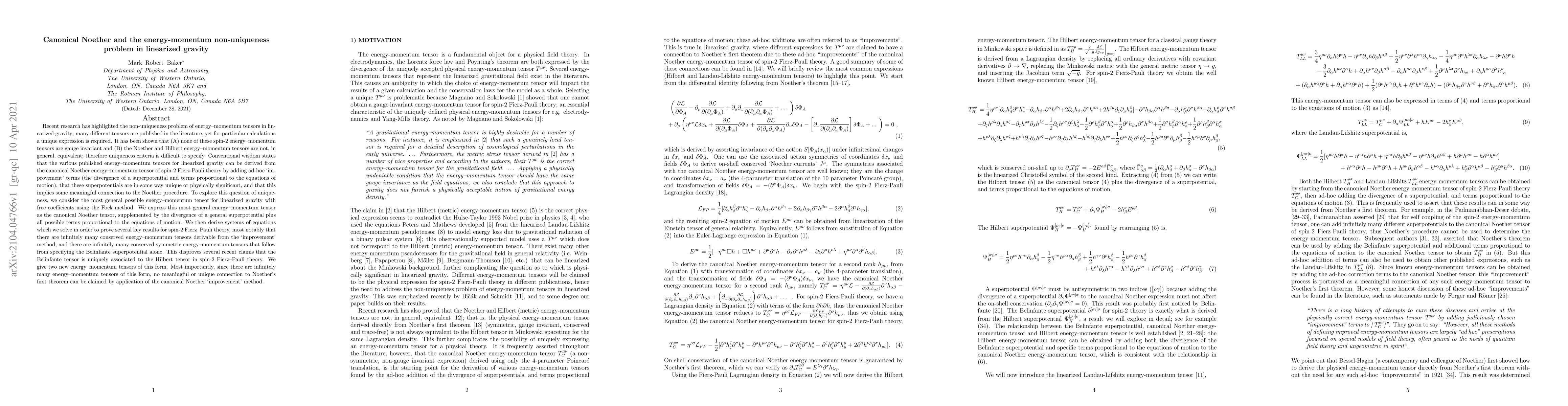 This paper investigates the non-uniqueness of energy-momentum tensors in linearized gravity, demonstrating that infinitely many conserved tensors can be derived from the canonical Noether tensor using 'improvement' terms. It concludes that no unique connection to Noether's theorem can be established due to the infinite possibilities.