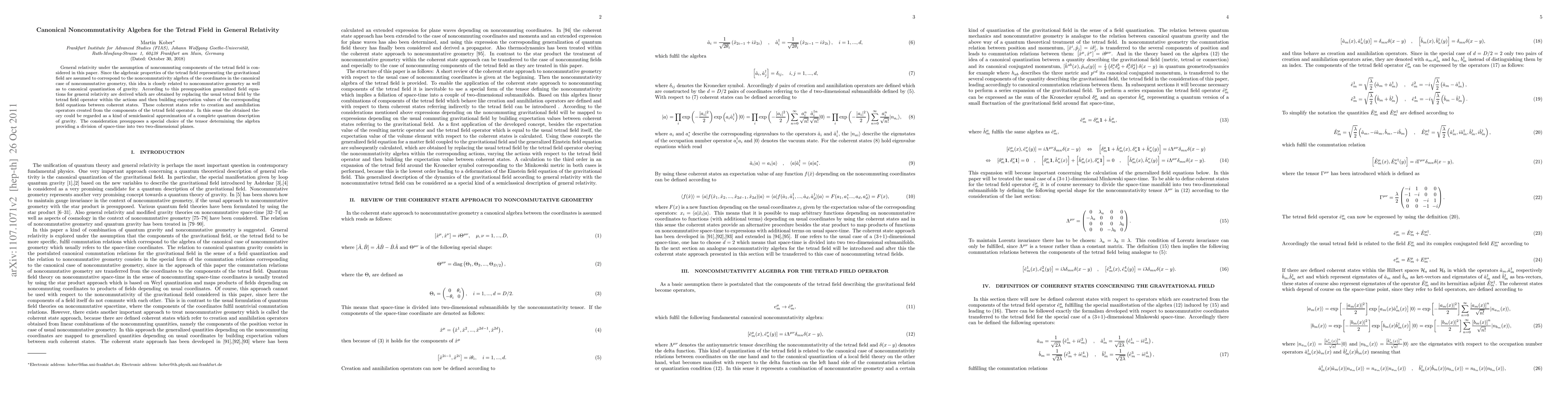 General relativity under the assumption of noncommuting components of the tetrad field is considered in this paper. Since the algebraic properties of the tetrad field representing the gravitational field are assumed to correspond to the noncommutativity algebra of the coordinates in the canonical case of noncommutative geometry, this idea is closely related to noncommutative geometry as well as to canonical quantization of gravity. According to this presupposition generalized field equations for general relativity are derived which are obtained by replacing the usual tetrad field by the tetrad field operator within the actions and then building expectation values of the corresponding field equations between coherent states. These coherent states refer to creation and annihilation operators created from the components of the tetrad field operator. In this sense the obtained theory could be regarded as a kind of semiclassical approximation of a complete quantum description of gravity. The consideration presupposes a special choice of the tensor determining the algebra providing a division of space-time into two two-dimensional planes.