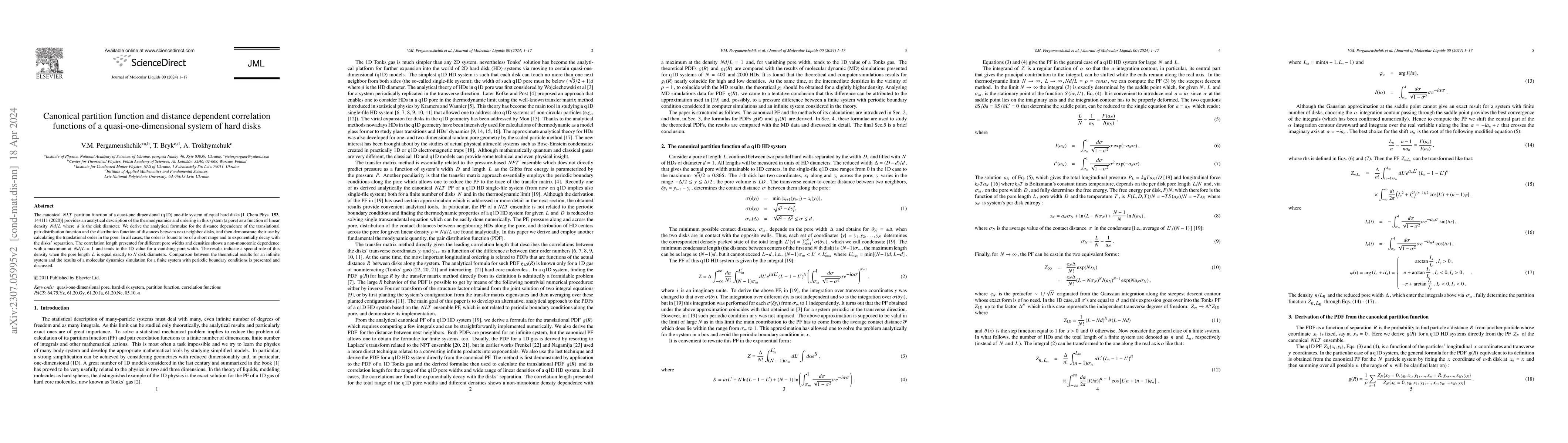 This paper analytically describes the thermodynamics and ordering in a quasi-one-dimensional system of hard disks using the canonical partition function. It finds that the translational order exponentially decays with disk separation, revealing a special density dependence with a maximum at Nd/L = 1. Comparisons with molecular dynamics simulations support these findings.