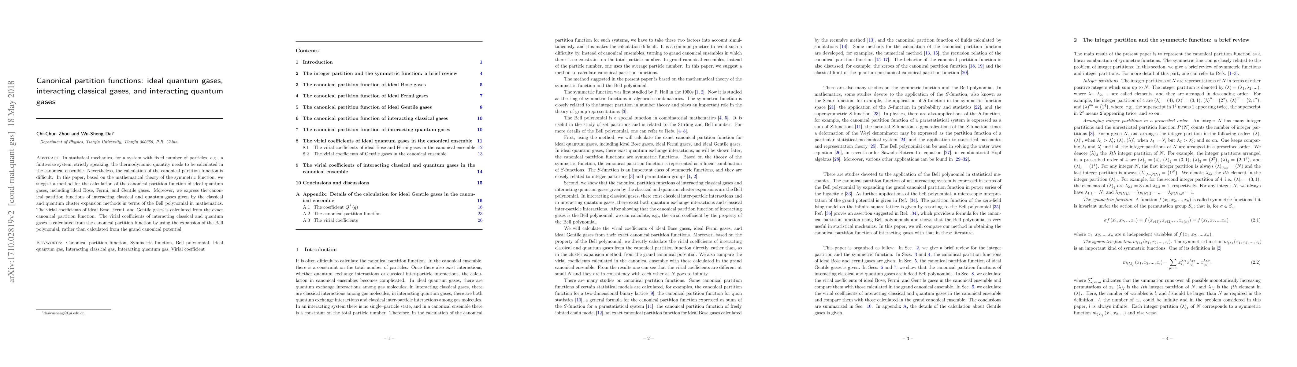 This paper proposes a novel method based on symmetric function theory to calculate the canonical partition functions for ideal quantum gases, including Bose, Fermi, and Gentile gases. It also extends this approach to interacting classical and quantum gases using Bell polynomials, providing exact virial coefficients for all considered systems.