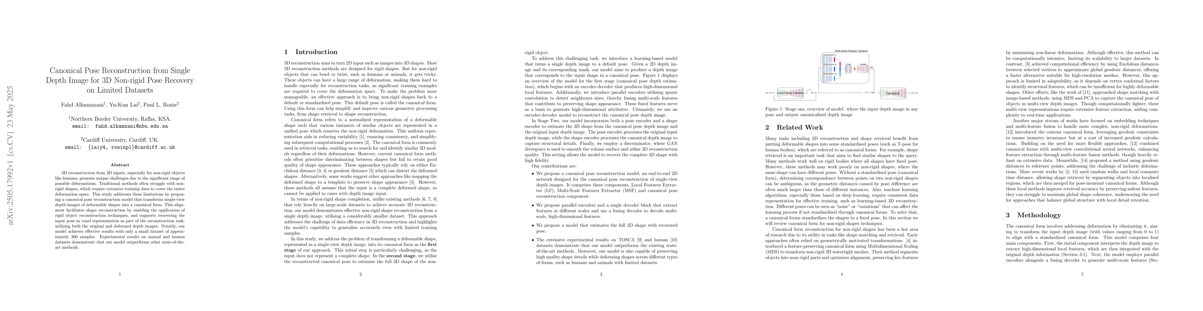 The paper introduces a novel learning-based approach for canonical pose reconstruction from single depth images, facilitating 3D non-rigid pose recovery on limited datasets using a two-stage model that combines depth and mask information.