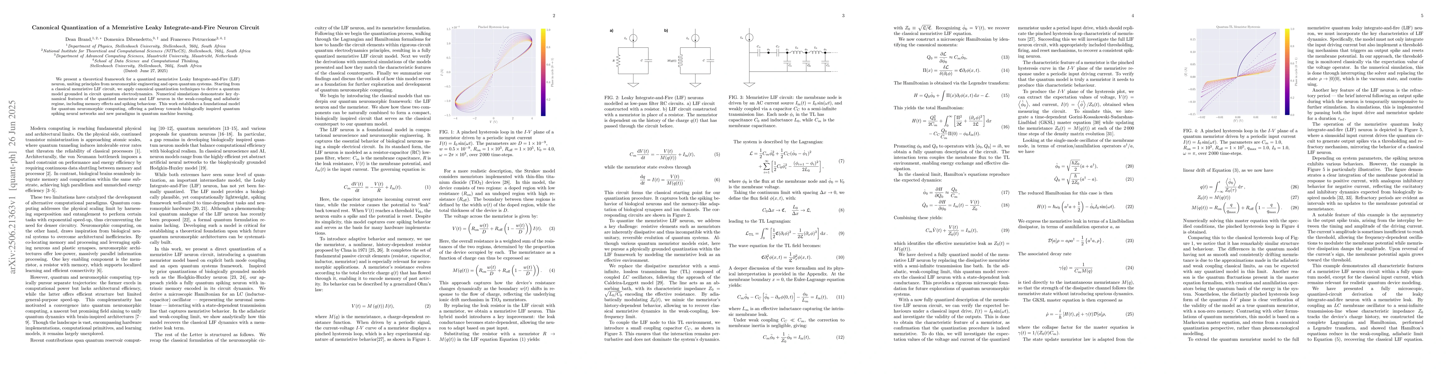 The paper offers a first-principles derivation of a quantum memristive LIF neuron, including the full Hamiltonian formulation and the incorporation of dissipative elements via a transmission line bath.