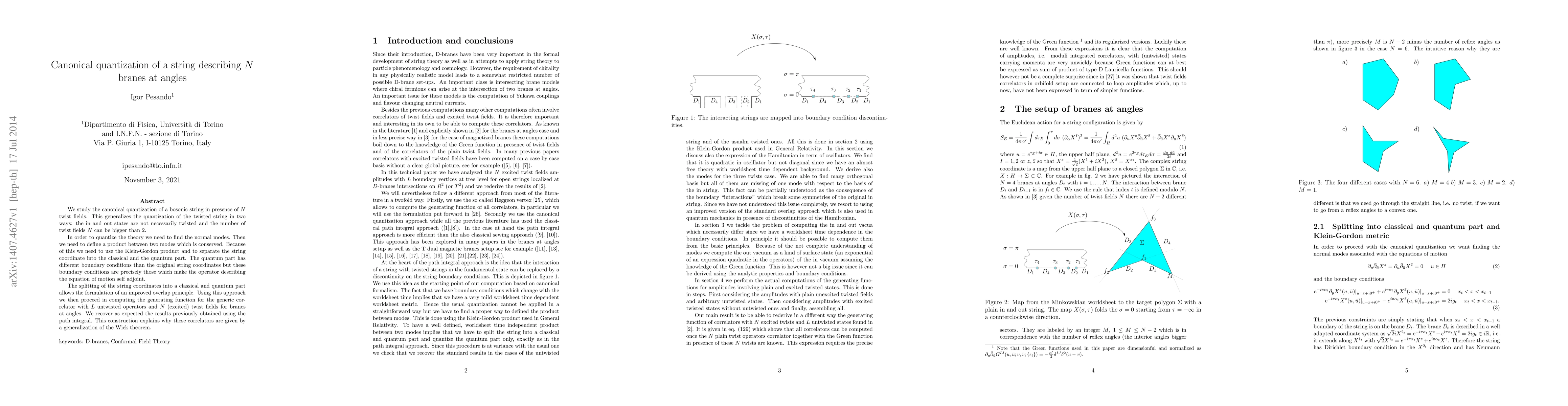 We study the canonical quantization of a bosonic string in presence of N twist fields. This generalizes the quantization of the twisted string in two ways: the in and out states are not necessarily twisted and the number of twist fields N can be bigger than 2. In order to quantize the theory we need to find the normal modes. Then we need to define a product between two modes which is conserved. Because of this we need to use the Klein-Gordon product and to separate the string coordinate into the classical and the quantum part. The quantum part has different boundary conditions than the original string coordinates but these boundary conditions are precisely those which make the operator describing the equation of motion self adjoint. The splitting of the string coordinates into a classical and quantum part allows the formulation of an improved overlap principle. Using this approach we then proceed in computing the generating function for the generic correlator with L untwisted operators and N (excited) twist fields for branes at angles. We recover as expected the results previously obtained using the path integral. This construction explains why these correlators