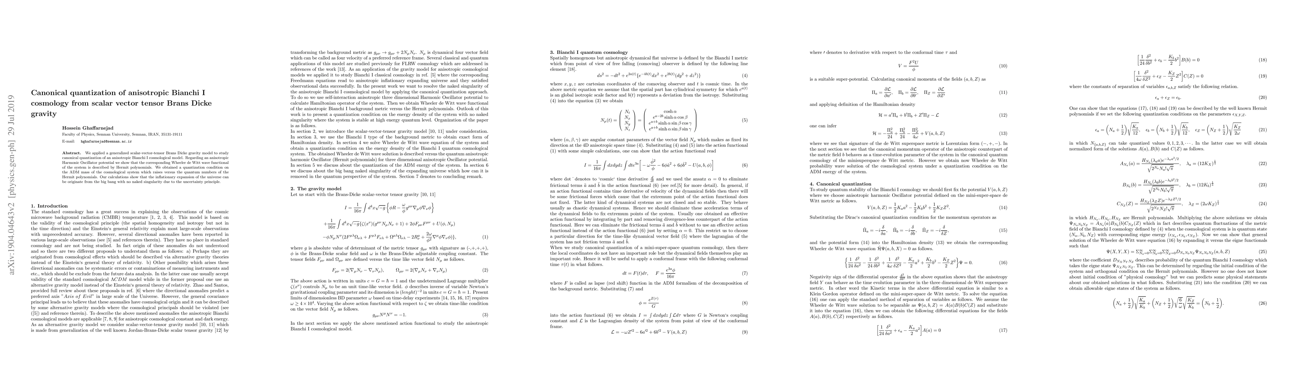 This paper applies a generalized scalar-vector-tensor Brans Dicke gravity model to canonically quantize an anisotropic Bianchi I cosmology, revealing that the Wheeler de Witt wave functional is described by Hermit polynomials. The study derives a quantization condition on the ADM mass linked to the quantum numbers of these polynomials, suggesting that inflationary expansion can emerge from a big bang without a naked singularity due to the uncertainty principle.