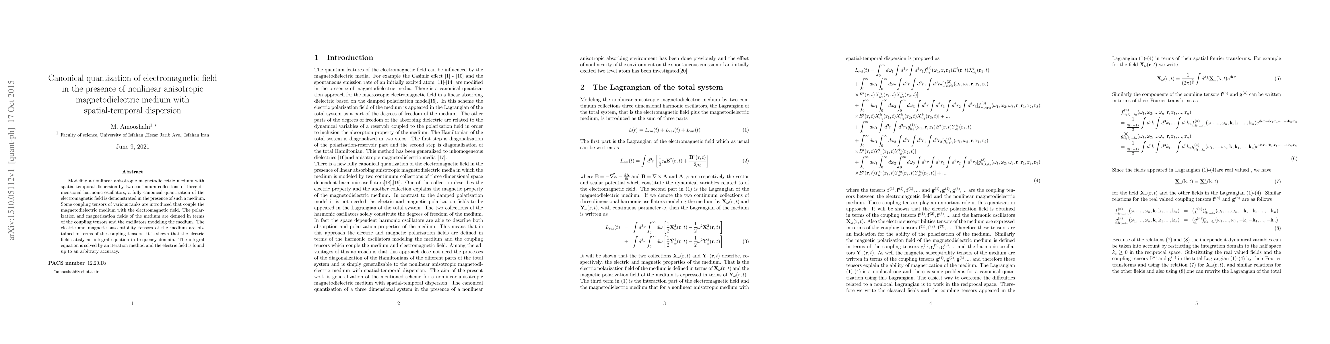 Modeling a nonlinear anisotropic magnetodielectric medium with spatial-temporal dispersion by two continuum collections of three dimensional harmonic oscillators, a fully canonical quantization of the electromagnetic field is demonstrated in the presence of such a medium. Some coupling tensors of various ranks are introduced that couple the magnetodielectric medium with the electromagnetic field. The polarization and magnetization fields of the medium are defined in terms of the coupling tensors and the oscillators modeling the medium. The electric and magnetic susceptibility tensors of the medium are obtained in terms of the coupling tensors. It is shown that the electric field satisfy an integral equation in frequency domain. The integral equation is solved by an iteration method and the electric field is found up to an arbitrary accuracy.