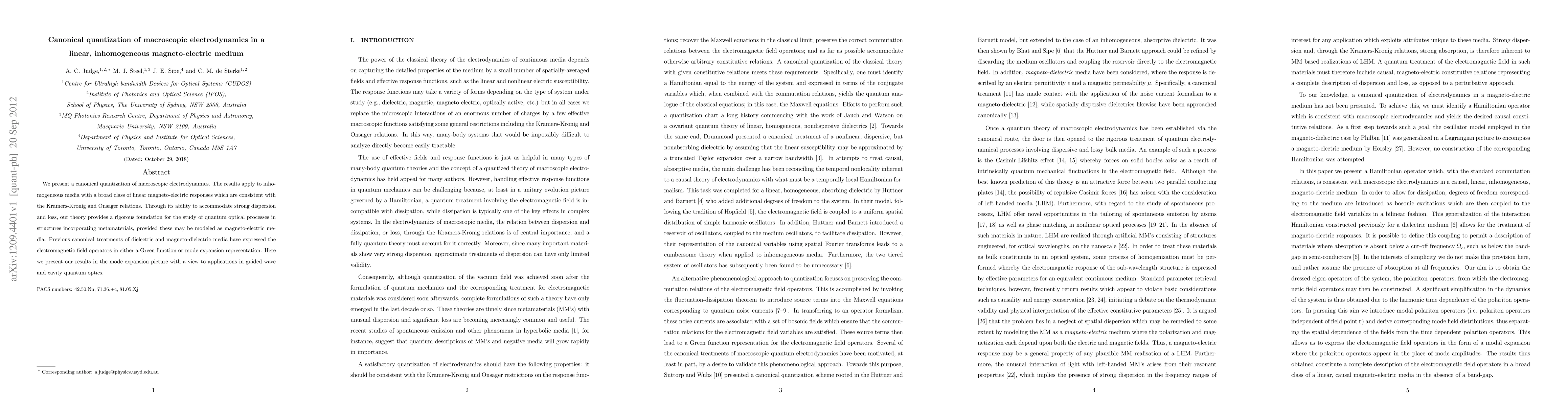 We present a canonical quantization of macroscopic electrodynamics. The results apply to inhomogeneous media with a broad class of linear magneto-electric responses which are consistent with the Kramers-Kronig and Onsager relations. Through its ability to accommodate strong dispersion and loss, our theory provides a rigorous foundation for the study of quantum optical processes in structures incorporating metamaterials, provided these may be modeled as magneto-electric media. Previous canonical treatments of dielectric and magneto-dielectric media have expressed the electromagnetic field operators in either a Green function or mode expansion representation. Here we present our results in the mode expansion picture with a view to applications in guided wave and cavity quantum optics.
