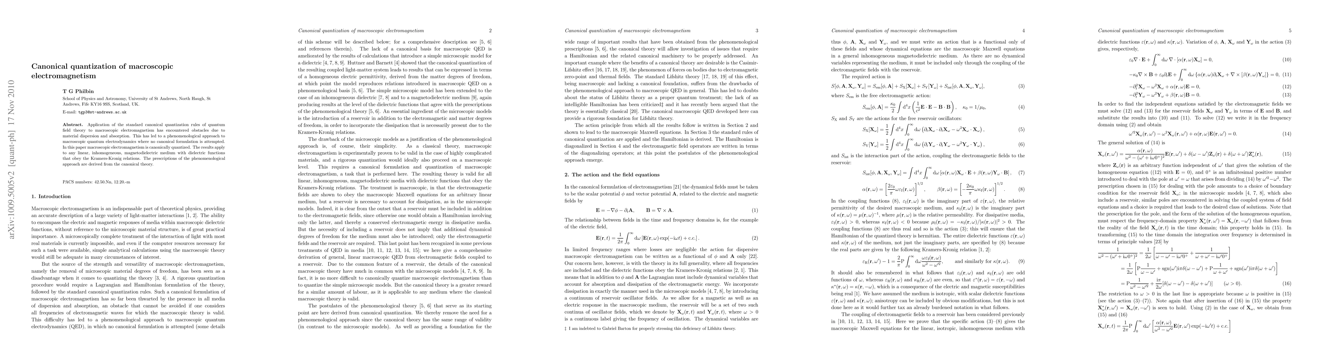 This paper successfully applies canonical quantization rules from quantum field theory to macroscopic electromagnetism, overcoming obstacles related to material dispersion and absorption. The results extend to any linear, inhomogeneous magnetodielectric medium, and derive phenomenological prescriptions from the canonical framework.