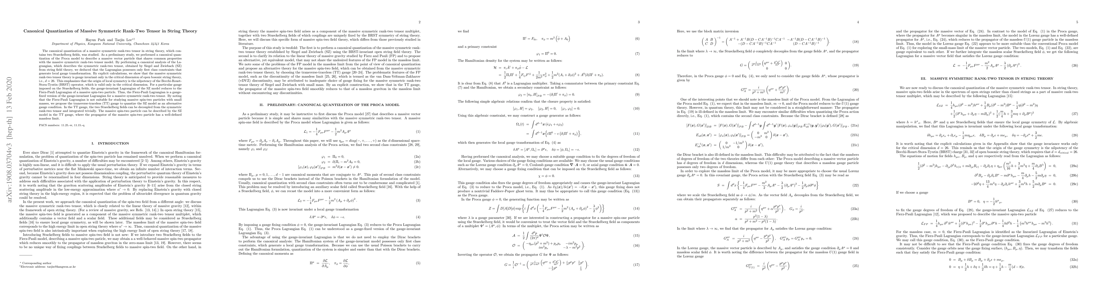 This paper explores the canonical quantization of a massive symmetric rank-two tensor in string theory, revealing that the theory is gauge invariant only in the critical dimension of open bosonic string theory ($d=26$). The study proposes the transverse-traceless gauge as an alternative to the Fierz-Pauli Lagrangian for describing massive spin-two particles.