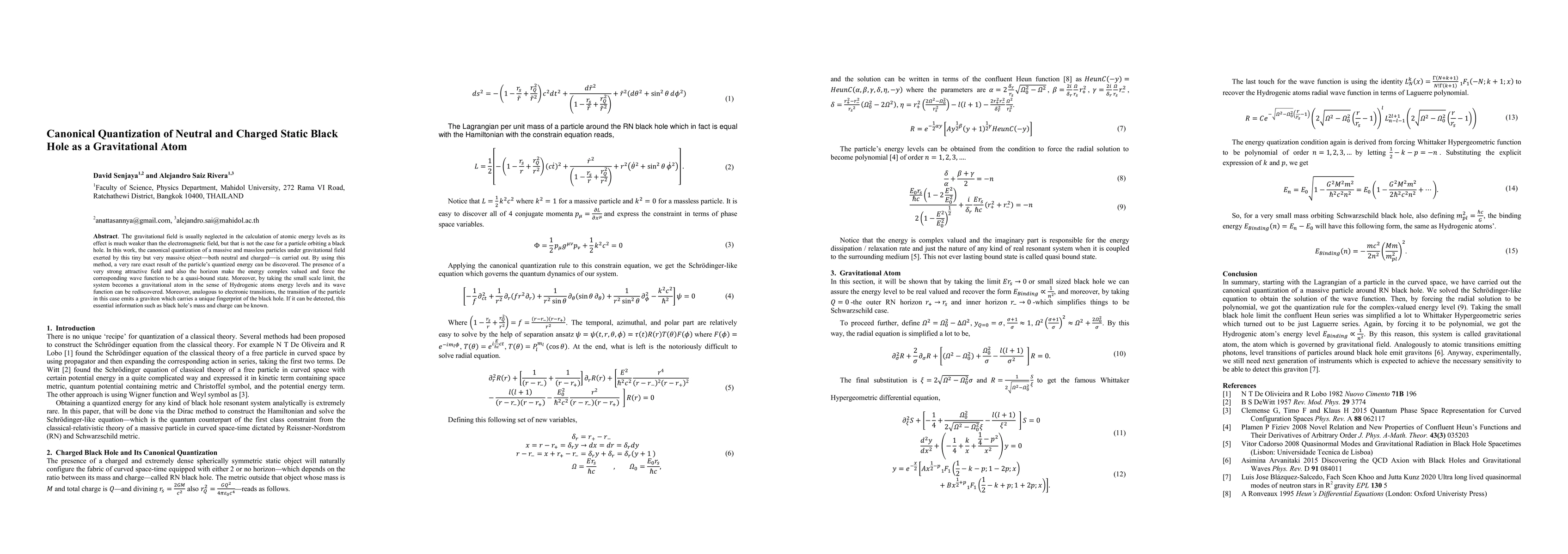 This paper explores the canonical quantization of particles orbiting neutral and charged static black holes, revealing complex-valued quantized energy levels due to the strong gravitational field. It also demonstrates that in a small scale limit, the system behaves like a gravitational atom, with particle transitions emitting gravitons that carry unique black hole characteristics.