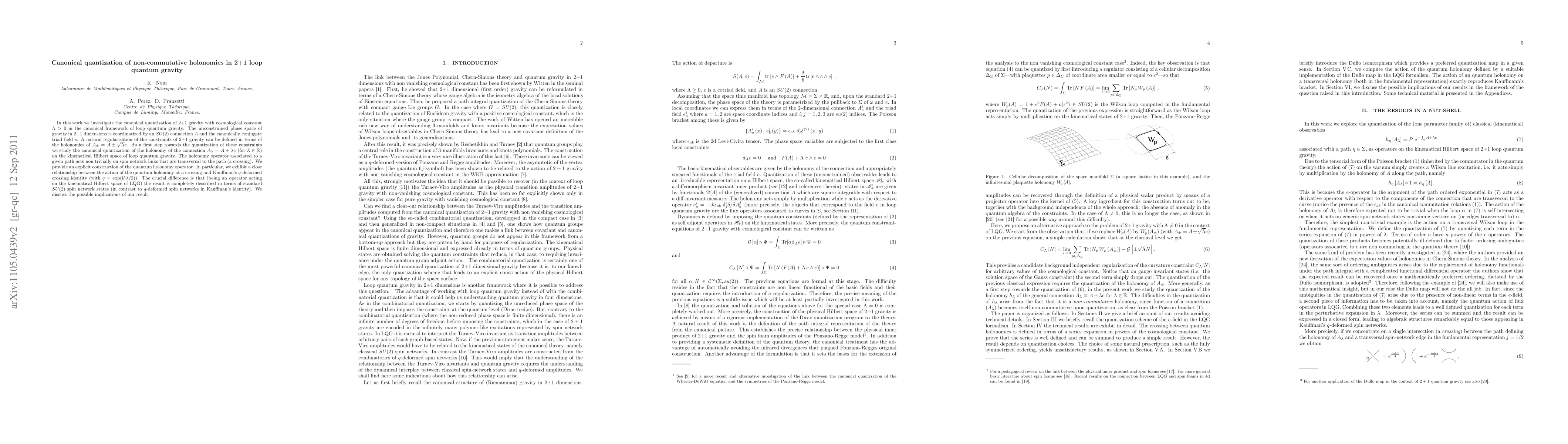 In this work we investigate the canonical quantization of 2+1 gravity with cosmological constant $\Lambda>0$ in the canonical framework of loop quantum gravity. The unconstrained phase space of gravity in 2+1 dimensions is coordinatized by an SU(2) connection $A$ and the canonically conjugate triad field $e$. A natural regularization of the constraints of 2+1 gravity can be defined in terms of the holonomies of $A+=A + \sqrt\Lambda e$. As a first step towards the quantization of these constraints we study the canonical quantization of the holonomy of the connection $A_{\lambda}=A+\lambda e$ on the kinematical Hilbert space of loop quantum gravity. The holonomy operator associated to a given path acts non trivially on spin network links that are transversal to the path (a crossing). We provide an explicit construction of the quantum holonomy operator. In particular, we exhibit a close relationship between the action of the quantum holonomy at a crossing and Kauffman's q-deformed crossing identity. The crucial difference is that (being an operator acting on the kinematical Hilbert space of LQG) the result is completely described in terms of standard SU(2) spin network states (in contrast to q-deformed spin networks in Kauffman's identity). We discuss the possible implications of our result.