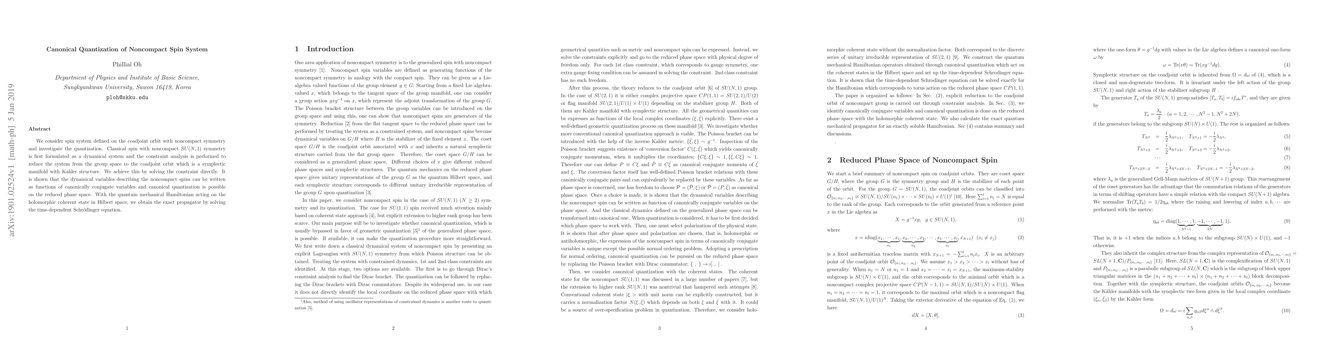 We consider spin system defined on the coadjoint orbit with noncompact symmetry and investigate the quantization. Classical spin with noncompact SU(N,1) symmetry is first formulated as a dynamical system and the constraint analysis is performed to reduce the system from the group space to the coadjoint orbit which is a symplectic manifold with Kahler structure. We achieve this by solving the constraint directly. It is shown that the dynamical variables describing the noncompact spins can be written as functions of canonically conjugate variables and canonical quantization is possible on the reduced phase space. With the quantum mechanical Hamiltonian acting on the holomorphic coherent state in Hilbert space, we obtain the exact propagator by solving the time-dependent Schrodinger equation.