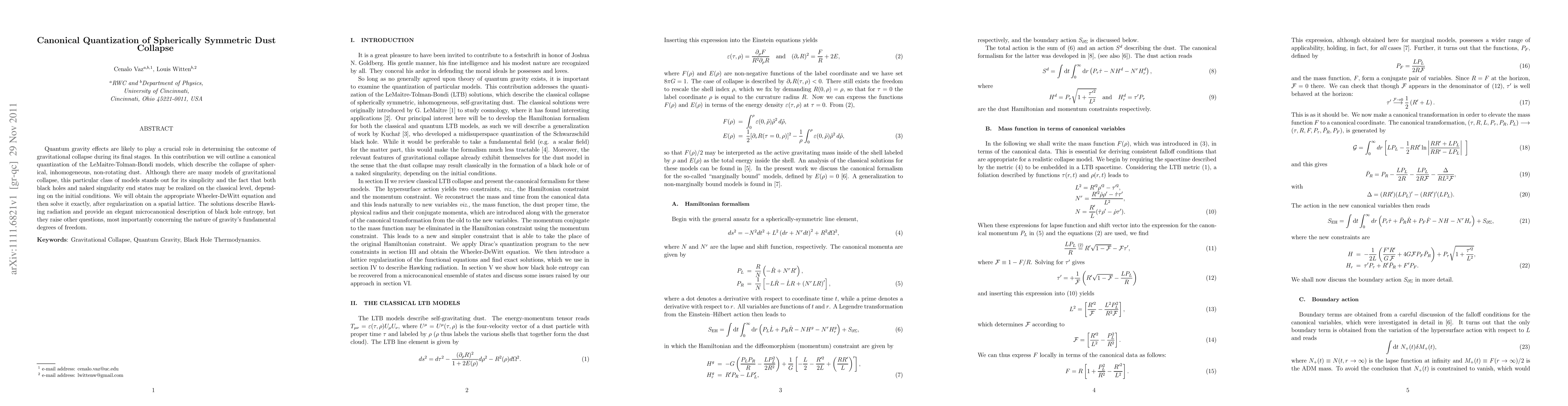 This paper outlines a canonical quantization of LeMaitre-Tolman-Bondi models for spherical, inhomogeneous dust collapse, deriving the Wheeler-DeWitt equation and solving it to describe Hawking radiation and black hole entropy, while also raising questions about the fundamental nature of gravity's degrees of freedom.