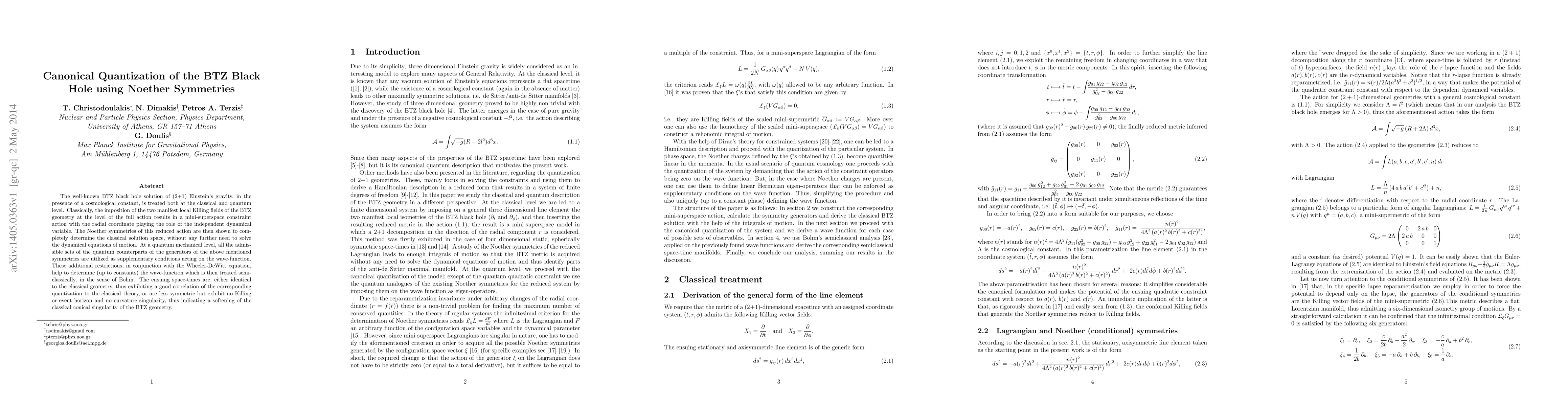 This research explores the canonical quantization of the BTZ black hole using Noether symmetries. Classically, it finds that Noether symmetries determine the solution space without solving the equations of motion. Quantum mechanically, these symmetries, along with the Wheeler-DeWitt equation, refine the wave-function, producing results that either match or soften the classical geometry, including its conical singularity.