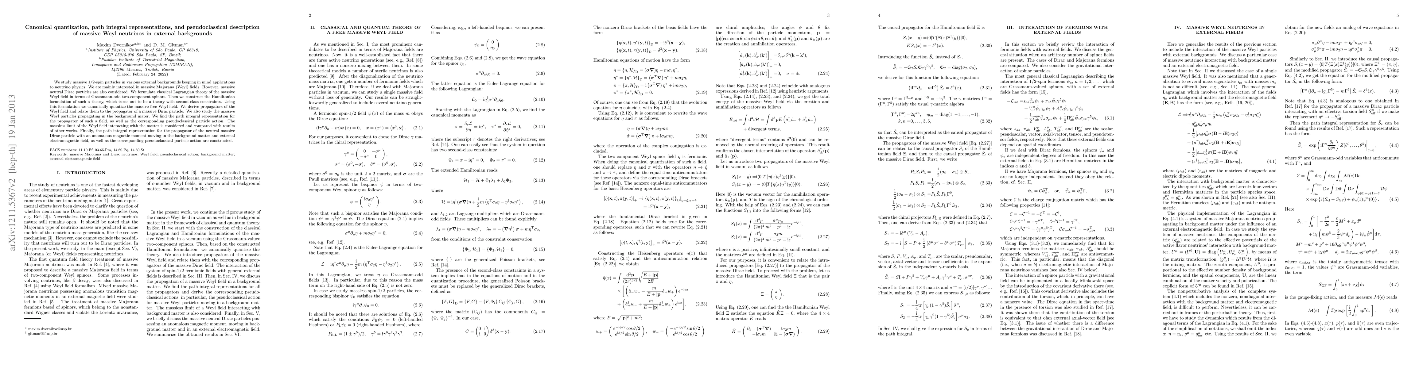 We study massive 1/2-spin particles in various external backgrounds keeping in mind applications to neutrino physics. We are mainly interested in massive Majorana (Weyl) fields. However, massive neutral Dirac particles are also considered. We formulate classical Lagrangian theory of the massive Weyl field in terms of Grassmann-odd two-component spinors. Then we construct the Hamiltonian formulation of such a theory, which turns out to be a theory with second-class constraints. Using this formulation we canonically quantize the massive free Weyl field. We derive propagators of the Weyl field and relate them to the propagator of a massive Dirac particle. We also study the massive Weyl particles propagating in the background mater. We find the path integral representation for the propagator of such a field, as well as the corresponding pseudoclassical particle action. The massless limit of the Weyl field interacting with the matter is considered and compared with results of other works. Finally, the path integral representation for the propagator of the neutral massive Dirac particle with an anomalous magnetic moment moving in the background matter and external electromagnetic field, as well as the corresponding pseudoclassical particle action are constructed.