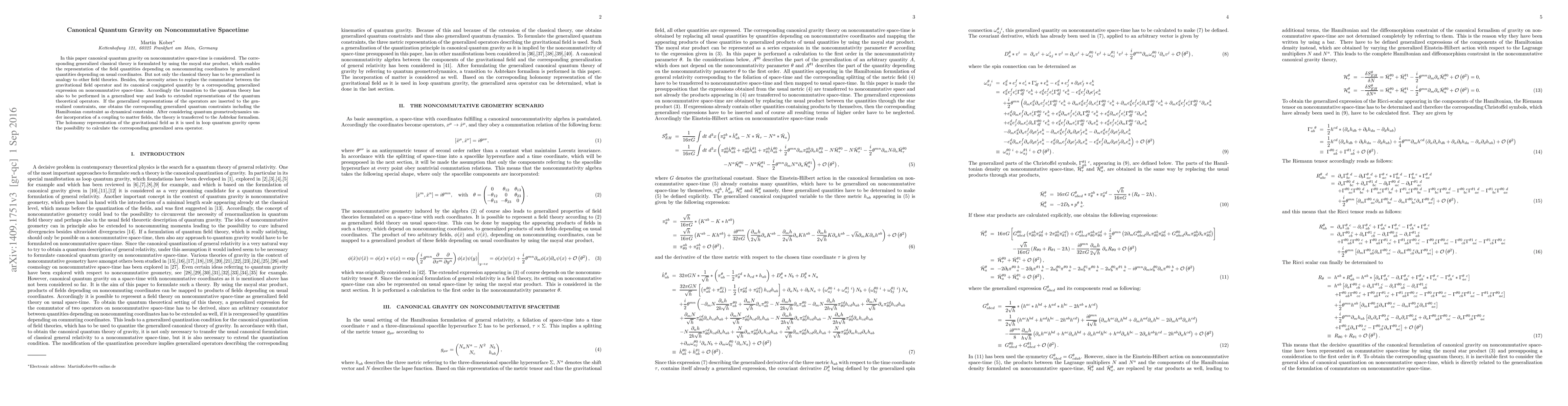 In this paper canonical quantum gravity on noncommutative space-time is considered. The corresponding generalized classical theory is formulated by using the moyal star product, which enables the representation of the field quantities depending on noncommuting coordinates by generalized quantities depending on usual coordinates. But not only the classical theory has to be generalized in analogy to other field theories. Besides, the necessity arises to replace the commutator between the gravitational field operator and its canonical conjugated quantity by a corresponding generalized expression on noncommutative space-time. Accordingly the transition to the quantum theory has also to be performed in a generalized way and leads to extended representations of the quantum theoretical operators. If the generalized representations of the operators are inserted to the generalized constraints, one obtains the corresponding generalized quantum constraints including the Hamiltonian constraint as dynamical constraint. After considering quantum geometrodynamics under incorporation of a coupling to matter fields, the theory is transferred to the Ashtekar formalism. The holonomy representation of the gravitational field as it is used in loop quantum gravity opens the possibility to calculate the corresponding generalized area operator.